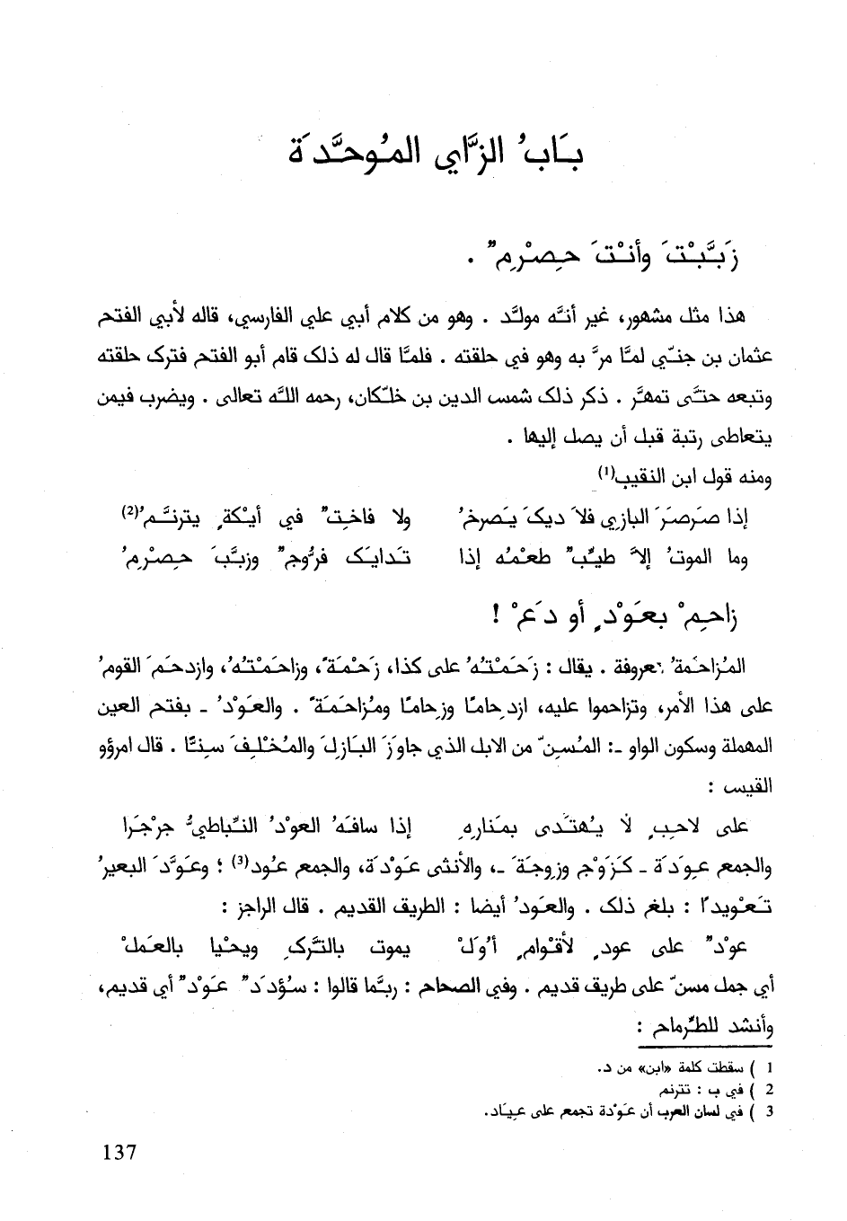 المزاحمة معروفة. يقال زحمته على كذا، زحمته، وزاحمته، وازدحم القوم على هذا الأمر وتزاحموا عليه، ازدحاما وزحاما ومزاحمة. والعود بفتح العين المهملة وسكون الواو: المسن من الذي جاور البازل والمخلف سنا. قال امرؤ القيس: