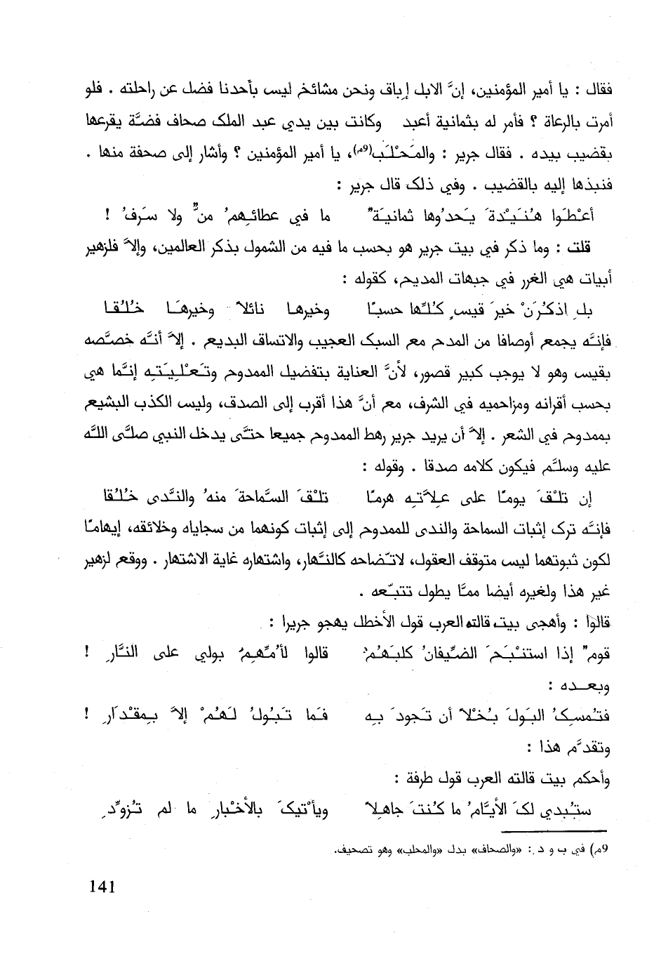فانه يجمع أوصافا من المديح مع السبك العجيب والاتساق البديع. إلاّ إنّه خصصه بقيس وهو لا يوجب كبير قصور، لأنَّ العناية بتفضيل الممدوح وتعليته إنّما هي بحسب أقرانه ومزاحميه في الشرف، مع إنَّ هذا اقرب إلى الصدق، وليس الكذب البشع بممدوح في الشعر. إلاّ إنَّ يريد جرير رهط الممدوح جميعا حتى يدخل النبي صلى الله عليه وسلم فيكون كلامة صدقا. وقوله: