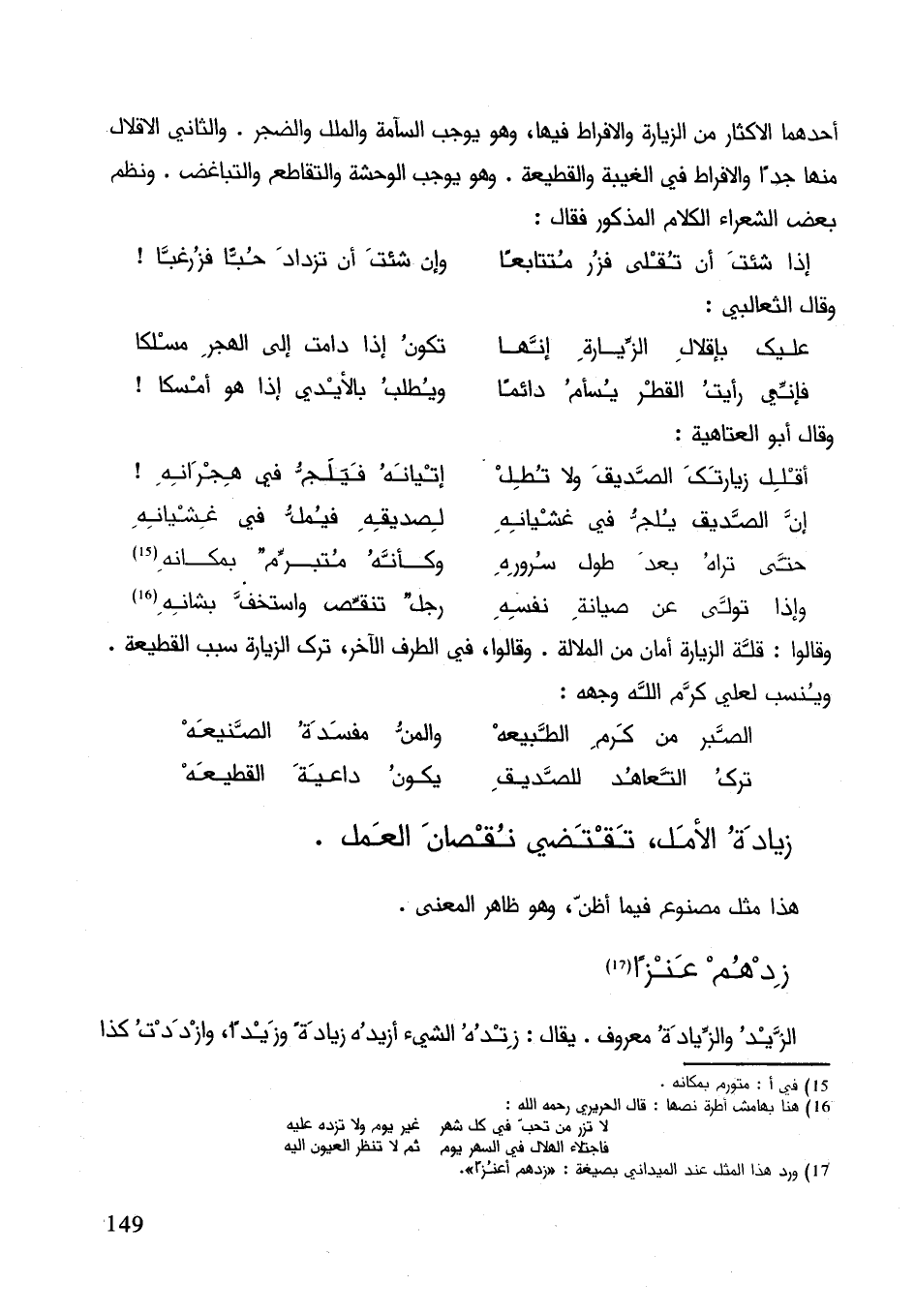 أحدهما الإكثار من الزيارة والإفراط فيها وهو يوجب السأم والملل والضجر. والثاني الإقلال منها جدا والإفراط في الغيبة والقطيعة. وهو يوجب الوحشة والتقاطع والتباعد. ونظم بعض الشعراء الكلام المذكور فقال: