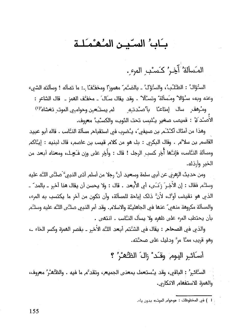 ومن حديث الزهري عن أبي سلمة وسعيد أنَّ رجلا من أسلم أتى النبي صلى الله عليه وسلم فقال: إن الأخر زنى أي الأبعد. قال: ولا يحسن أن يقال هنا آخر بالمد الذي هو نقيض أول لأنَّ ذلك إباحة للمسألة وإن يكون من آخر ما يكسب به المرء والمسألة مكروهة منهي عنها في الجاهلية والإسلام وقد أمر النبي صلى الله عليه وسلم بأن يحتطب المرء على ظهره ولا يسأل الناس. انتهى.