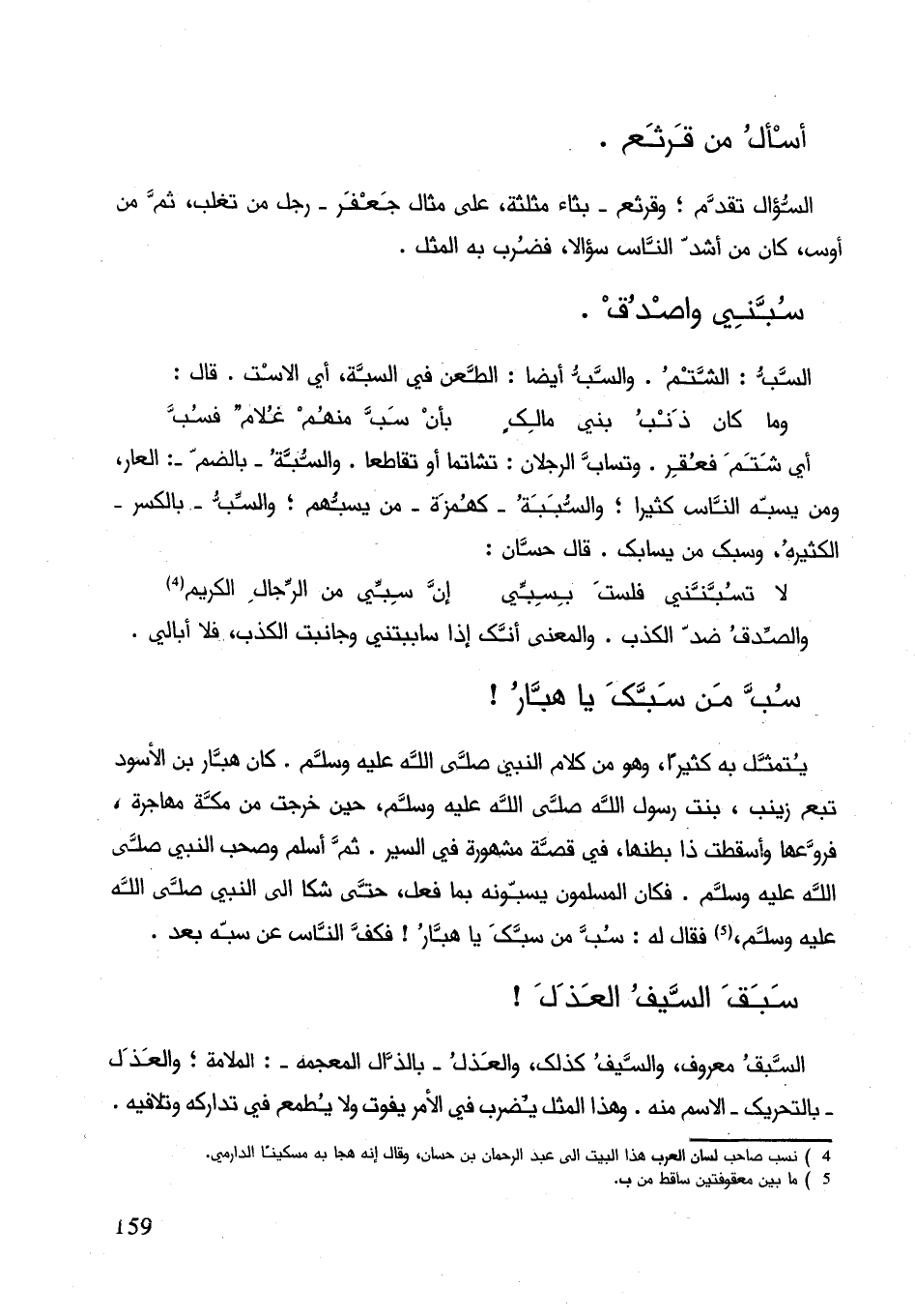 أي شتم فعقر. وتساب الرجلان: تشاتما أو تقاطعا. والسبة بالضم: العار ومن يسبه الناس كثيرا؛ والسببة كهمزة من يسبهم؛ والسب بالكسر الكثرة وسبك من يسابك. قال حسان: