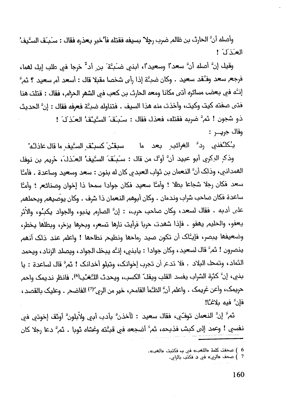 وذكر البكري أبو عبيد إنَّ أوّل من قال: سبق السبق العذل، خريم بن نوفل الهمداني، وذلك أنَّ النعمان بن ثواب العبدي كان له بنون: سعد وسعيد وساعدة. فأما سعد فكان رجلا شجاعا بطلا؛ وأما سعيد فكان جوادا سمحا ذا إخوان وصنائع؛ وأما ساعدة فكان صاحب شراب وندمان. وكان أبوهم النعمان ذا شرف. وكان يوصيهم ويحملهم على أدبه. فقال لسعد، وكان صاحب حرب: إنَّ الصارم ينبو، والجواد يكبو، والأثر يعفو، والحليم يهفو. فإذا شهدت حربا فرأيت نارها تستعر، وبحرها يزخر، وبطلها يخط، وضعيفها يبصر فإياك أنَّ تكون صدي رماحها ونطيح نطاحها! وأعلم عند ذلك انهم ينصرون! ثم قال لسعيد، وكان جواداً: يا بني إنّه يبخل الجواد، ويصلد الزناد، ويحمد الثماد، وتحمل البلاد. فلا تدع إنَّ تجرب إخوانك وتبلوا أخدانك! ثم قال لساعدة: يا بني، إنَّ كثرة الشراب يفسد القلب ويقل الكسب، ويحدث اللغب. فأنظر نديمك واحم حريمك، وأعن غريمك. واعلم أن الظمأ القامح، خير من الري الفاضح. وعليك بالقصد، فإنَّ فيه بلاغا!