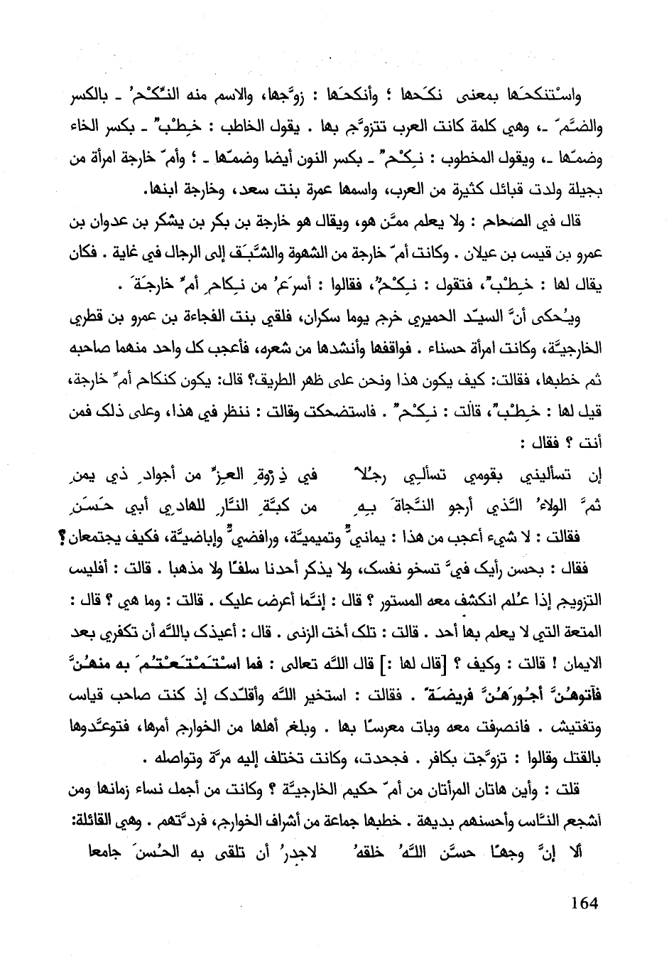فقالت: لا شيء أعجب من هذا: يماني وتميمية، ورافضي وإباضية، فكيف يجتمعان؟ فقال: بحسن رأيك في تسخو نفسك، ولا يذكر أحدنا سلفا ولا مذهبا. قالت: أفليس التزويج إذا علم انكشف معه المستور؟ قال: إنّما أعرض عليك. قالت وما هي؟ قال: المتعة التي لا يعلم بها أحد. قالت: تلك أخت الزنى. قال: تلك أخت الزنى. قال: أعيذك بالله إنَّ تكفري بعد الإيمان! قالت: وكيف؟ قال لها:) فما استمتعتم به منهن فآتوهن أجورهن فريضة (. فقالت: استخير الله وأقلدك إذ كنت صاحب قياس وتفتيش. فانصرفت معه وبات معرسا بها. وبلغ أهلها من الخوارج أمرها، فتوعدوها بالقتل وقالوا: تزوجت بكافر. فجحدت وكانت تخلف إليه مرة وتواصله.