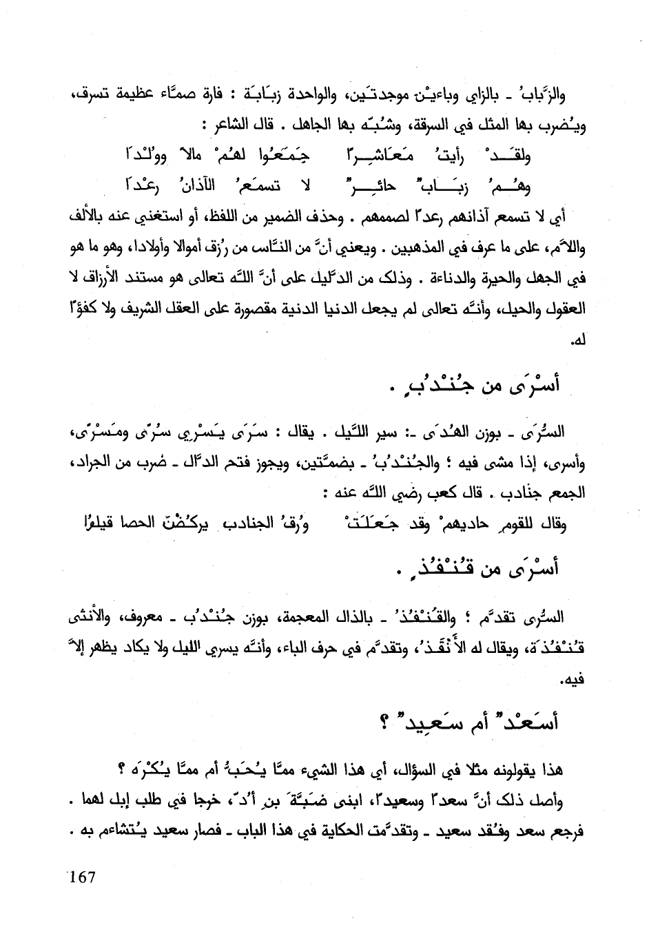 هذا يقولنه مثلا في السؤال أي هذا الشيء مما يحب أم مما يكره؟ وأصل ذلك أنَّ سعداً وسعيداً أبني ضبة بن أد خرجا في طلب إبل لهما. فرجع سعد وفقد سعيد وتقدمت الحكاية في هذا الباب فصار سعيد يتشاءم به.