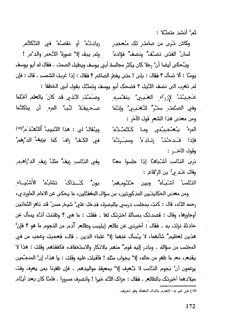 ومن معنى الحكايتين المذكورتين، من سؤال المغافلين، ما يحكى عن الإمام الماوردي، رحمه الله، قال: كنت بمجلس درسي بالبصرة، فدخل علي شيخ مسن قد ناهز الثمانين أو جاوزها، قال: قصدتك بمسألة اخترتك لها. فقلت: ما هي؟ وظننت إنّه يسأل عن حادثة نزلت به. فقال عن طالع إبليس وطالع آدم من النجوم ما هو؟ فإنَّ هذين لعظيم شأنهما، لا يسأل عنهما إلاّ علماء الدين. قال، فعجبت وعجب من في المجلس من سؤاله. وبادر إليه قوم منهم بالإنكار والاستخفاف، فكففتهم وقلت: هذا لا يقنع مع ما ظهر من حاله، إلاّ بجواب مثله! فأقبلت عليه وقلت: يا هذا، إنَّ النجمين يزعمون إنَّ نجوم الناس لا تعرف إلاّ بمعرفة مواليدهم. فإنَّ ظفرنا بمن يعرف وقت ميلادهما أخبرك بالطالع. فقال: جزاك الله خيرا! وانصرف مسرورا. فلما كان بعد أيام