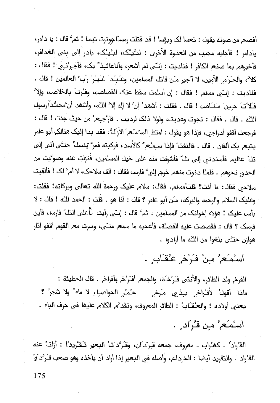 أفصح من صوته يقول: تعسا لك وبؤسا! قد قتلت رمسا ووترت تيسا! ثم قال: يا دامر، يا دامر! فأجابه مجيب من العدوة الأخرى: لبيك لبيك بادر إلى بني الغدافر، فاخبرهم بما صنع الكافر! فناديت: إني لم أشعر، وأنا عائد بك فأجرني! فقال: كلا، والحرم الأمين، لا أجير من قاتل المسلمين، وعبد عبر رب عالمين! قال. فناديت: إني مسلم! فقال: إنَّ أسلمت سقط عنك القصاص، وفزت بالخلاص، وإلاّ فلات حين مناص! قال. فقلت إنَّ لا اله إلاّ الله، وأشهد إنَّ محمّد رسول الله. قال. فقال: نجوت وهديت، ولولا ذلك لرديت. فأرجع من حيث جئت! قال: فرجعت أقفو أدراجي، فإذا هو يقول: امتط السمع الأزل، فقد بدا إليك هنالك أبو عامر يتبع بك ألفان. قال. فالتفت فإذا سمع كالأسد، فركبه فمر ينسل حتى أتى إلى تل عظيم فاسندني إلى تل فأشرفت منه خيل المسلمين، فنزلت عنه وصوب من الحدور نحوهم. فلما دنوت منهم خرج إلي فارس فقال: ألق سلاحك، لا أم لك! فألقيت سلاحي فقال: ما أنت؟ قلت مسلم: فقال سلام عليك ورحمة الله تعالى وبركاته! فقلت: وعليك السلام والرحمة والبركة، من أبو عامر؟ قال: أنا هو. قلت: الحمد لله! قال: لا بأس عليك! هؤلاء إخوانك من المسلمين. ثم قال: إني رأيت بأعلى التل فارسا، فأين فرسك؟ قال: فقصصت عليه القصة، فأعجبه ما سمع مني، وسرت مع القوم أقفو آثار هوزان حتى بلغوا من الله ما أرادوا.