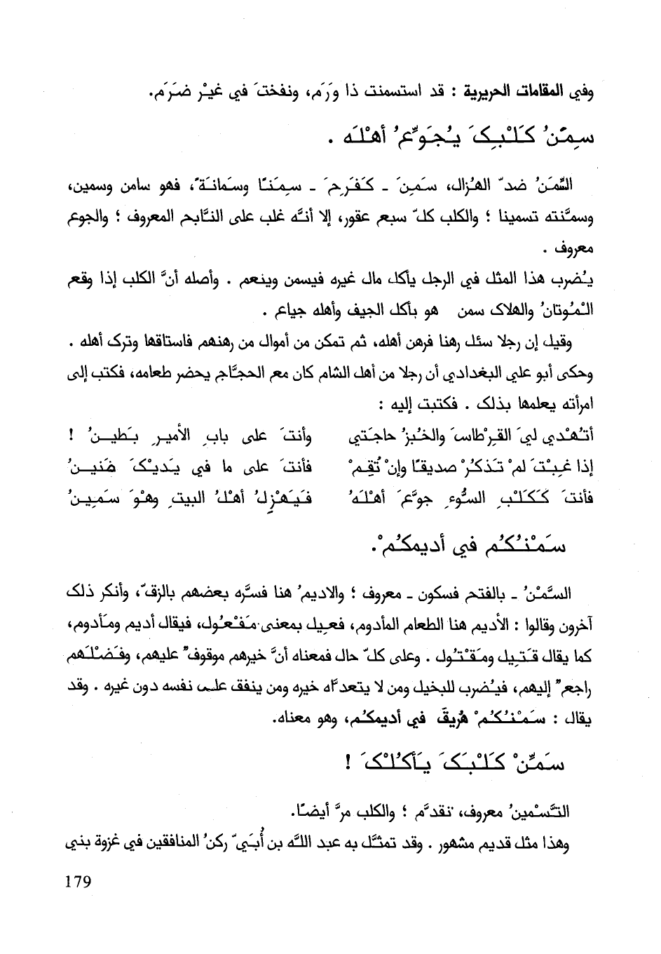 السمن بفتح فسكون معروف؛ والأديم هنا فسره بعضهم بالزق وأنكر ذلك آخرون وقالوا: الأديم هنا الطعام المأدوم فعيل بمعنى مفعول فيقال أديم ومأدوم كما يقال قتيل ومقتول. وعلى كل حال فمعناه أنَّ خيرهم موقوف عليهم وفضلهم راجع إليهم فيضرب للبخيل ومن لا يتعداه خيره ومن ينفق على نفسه دون غيره. وقد يقال: سمنكم هريق في أيديكم وهو معناه.