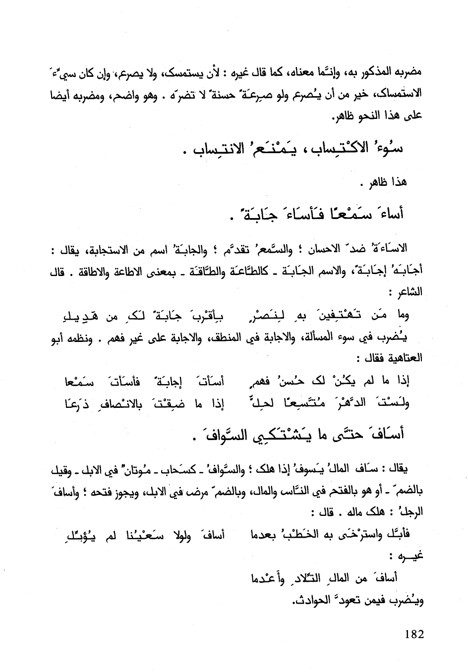 الإساءة ضد الإحسان؛ والسمع تقدم؛ والجابة اسم من الإجابة يقال: أجابه إجابة والاسم الجابة كالطاعة والطاقة بمعنى الإطاعة والإطاقة. قال الشاعر: