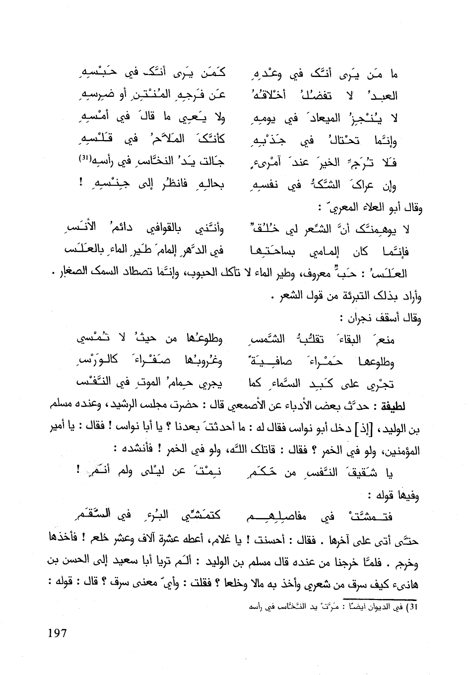 لطيفة: حدث بعض الأدباء عن الأصمعي قال: حضرت مجلس الرشيد، وعند مسلم بن الوليد إذ دخل أبو نواس فقال له: ما أحدثت بعدنا؟ يا أبا نواس! فقال: يا أمير المؤمنين، ولو في الخمر؟ فقال: قاتلك الله، ولو في الخمر! فأنشده: