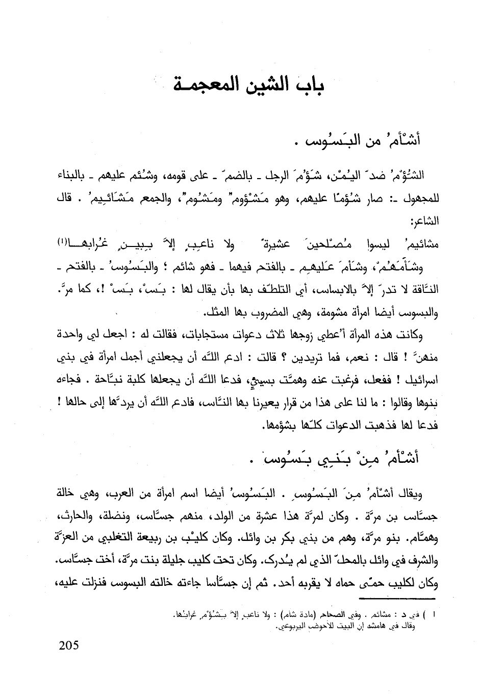 وشأمهم وشأم عليهم بالفتحح فيهما فهو شائم؛ والبسوس بالفتح الناقة لا تدر إلاّ بالابساس أي التلطف بها بأن يقال لها: بس، بس! كما مر. والبسوس أيضاً امرأة مشومة، وهي المضروب بها المثل.