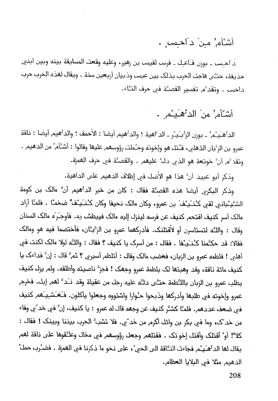 وذكر البكري أيضاً هذه القصة فقال: كان من خبر الدهيم أنَّ مالك بن كرمة الشيباني لقي كنيف بن عمرو وكان مالك نحيفا وكان كنيف ضخما. فلما أراد مالك أسر كنيف اقتحم كنيف عن فرسه لينزل إليه مالك فيبطش به. فأوجره مالك السنان وقال: والله لتستاسرن أو لأقتلنك. فأدركهما عمرو بن الزبان فاختصما فيه هو ومالك فقالا: قد حكمنا كنيفا. فقال: من اسرك يا كنيف؟ فقال: والله لولا مالك لكنت في أهلي! فلطمه عمرو بن الزبان فغضب مالك وقال: أتلطم أسيري؟ ثم قال: إنَّ فاءك يا كنيف مائة ناقة وقد وهبتها لك بلطمة عمرو وجهك! فجز ناصيته وأطلقه. ولم يزل كنيف يطلب عمرو بن الزبان باللطمة حتى دله عليه رجل من عقيلة وقد ند لهم إبل. فخرج عمرو واخوته في طلبها وأدركها وذبحوا حوارا واشتووه وجعلوا يأكلون. فغشيهم كنيف في ضعف عددهم. فلما كشف كنيف عن وجهه قال له عمرو: يا كنيف إنَّ في خدي وفاء من خدك وما في بكر بن وائل أكرم من خدي. فلا تشب الحرب بيننا وبينك! فقال: كلا! أو أقتلك وأقتل اخوتك. فقتلهم وجعل رؤوسهم في مخال وعلقها على ناقة لهم يقال لها الدهيم فجاءت الناقة إلى الحي على نحو ما ذكرنا في الهمزة. فضرب حمل الدهيم مثلا في البلايا العظام.