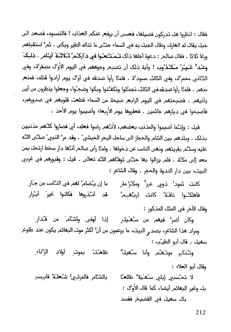 فقال: انظروا هل تدركون فصيلها، فعسى أنَّ يرفع العذاب! فالتمسوه، فصعد إلى جبل يقال له الغارة، وطال الجبل به السماء حتى ما تناله الطير وبكى، ثم أستقبلهم ورغا ثلاثا صالح: دعوة أجهلها ذاك تمتعوا في داركم ثلاثة أيام. ذلك وعد غير مكذوب! وآية ذلك أنَّ تصبح وجوههم في اليوم الأول مصفرة، وفي الثاني محمرة، وفي الثالث مسودة. فلما رأوا صدقه في أوّل يوم أرادوا قتله، فمنع منهم. فلما رأوا صدقه في الثالث تجملوا وتكفنوا وبكوا وضجوا، وجعلوا ينظرون من أين يأتيهم في ديارهم جاثمين. فعقروها يوم الأربعاء وأصيبوا يوم الأحد.