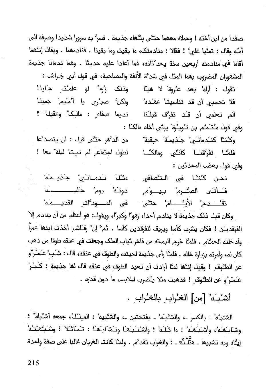 صفدا من أبن أخته! وحملاه معهما حتى بلغاه جذيمة. فسر به سروراً شديداً وصرفه إلى أمه وقال: تمنيا علي! فقلا: منادمتك، ما بقيت وما بقينا. فنادمهما. ويقال انهما أقاما في منادمه أربعين سنة يحدثانه، فما أعادا عليه حديثا. وهما ندما جذيمة المشهوران المضروب بهما المثل في شدة الألفة والمصاحبة، في قول أبي خراش: