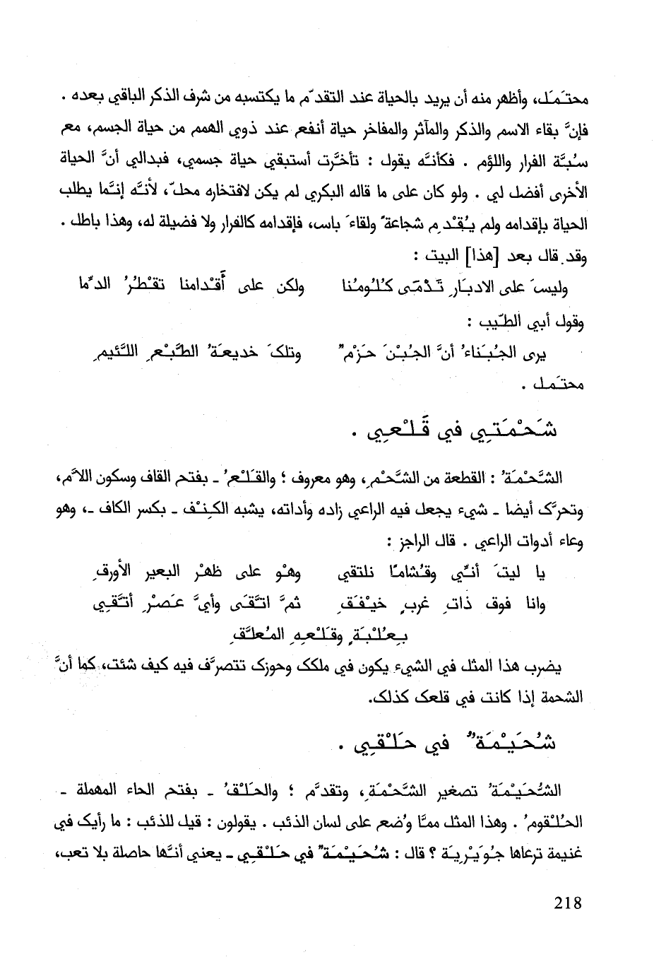 محتمل وأظهر منه إنَّ يريد بالحياة عند التقدم ما يكتسبه من شرف الذكر الباقي بعده. فإنَّ بقاء الاسم والذكر والمآثر والمفاخر حياة انفع عند ذوي الهمم من حياة الجسم مع سبة الفرار واللوم. فكأنه يقول: تأخرت أستبقي حياة جسمي فبدالي الله تعالى الحياة الأخرى افضل لي. ولو كان على ما قاله البكري لم يكن لافتخاره محل لأنّه إنّما يطلب الحياة بإقدامه ولم يقدم شجاعة ولقاء بأس فإقدامه كالفرار ولا فضيلة له وهذا باطل. وقد قال بعد هذا البيت: