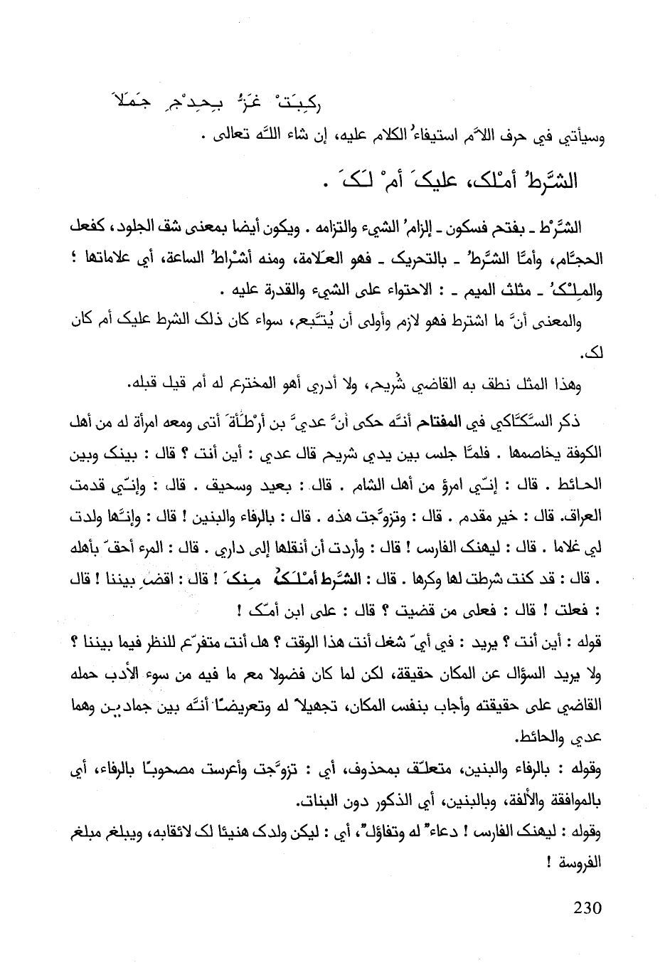 ذكر السكاكي في المفتح إنّه حكى أنَّ عدي بن أرطة أتى ومعه امرأة له مثال أهل الكوفة يخاصمها. فلما جلس بين يدي شريح قال له عدي: أين أنت؟ قال: بينك وبين الحائط. قال: إني امرؤ من أهل الشام. قال: بعيد وسحيق. قال: وإني قدمت العراق. قال: خير مقدم. قال: وتزوجت هذه. قال: بالرفاء والبنين! قال: إنّها ولدت لي غلاما. قال: ليهنك الفارس! قال: وأردت أنَّ أنقلها إلى داري. قال: المرء أحق بأهله. قال: كنت شرطت لها وكرها. قال: الشرط أملك منك! قال: أقض بيننا! قال: فعلت! قال: فعلى من قضيت؟ قال: على أبن أمك! قوله: أين أنت؟ يريد: في أي شغل أنت هذا الوقت؟ هل أنت متفرغ للنظر فيما بيننا؟ ولا يريد السؤال عن المكان حقيقة، ولكن لمّا كان فضولا مع ما فيه من سوء الأدب حمله القاضي على حقيقته وأجاب بنفس المكان، تجهيلا له وتعريضاً إنّه بين جمادين وهما عدي والحائط.