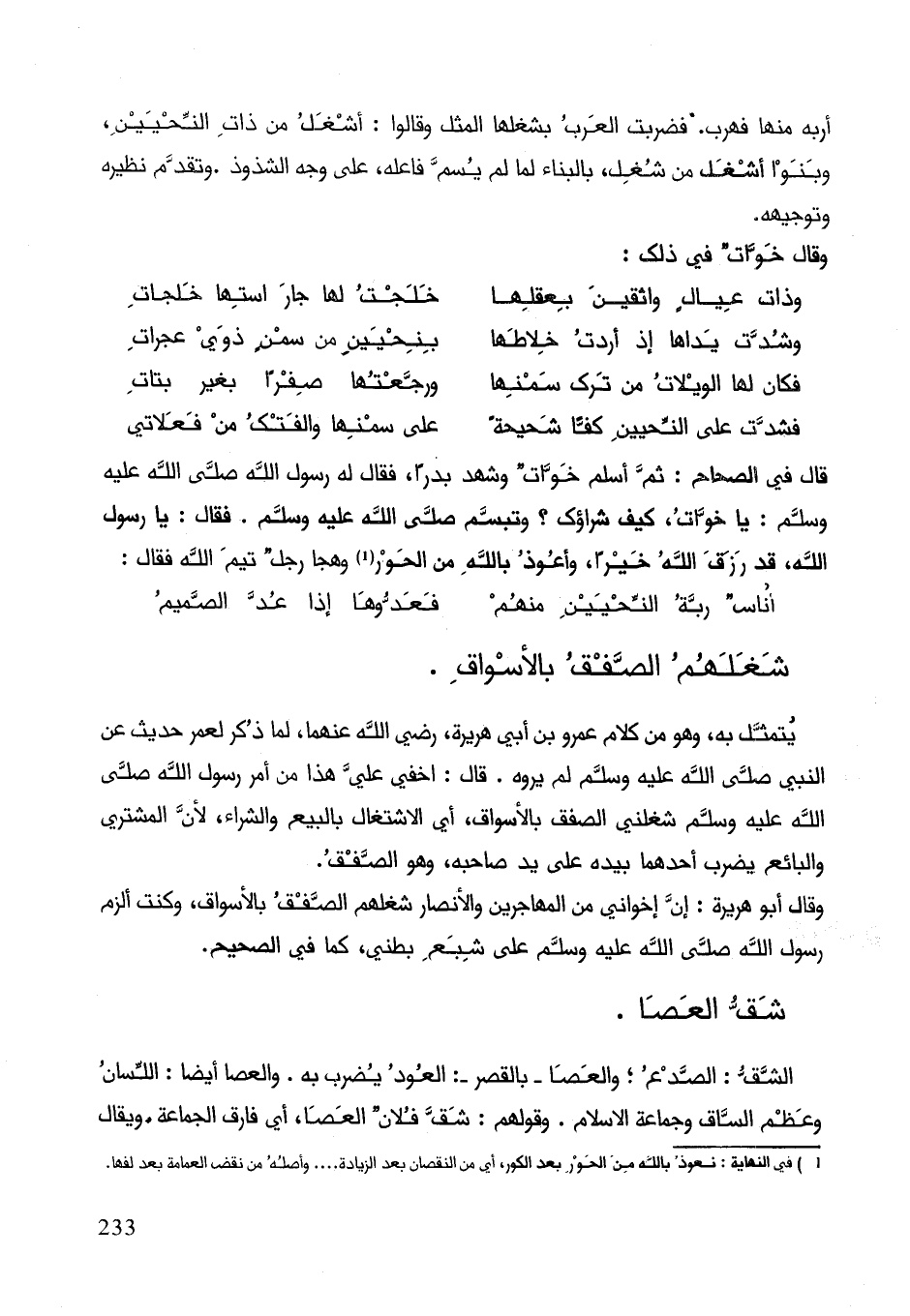 أربه منها فهرب. فضربت العرب بشغلها المثل وقالوا: اشغل من ذات النحيين، وبنو أشغل من شغل بالبناء لمّا لم يسم فاعله، على وجه الشذوذ. وتقدم نظيره وتوجيهه.