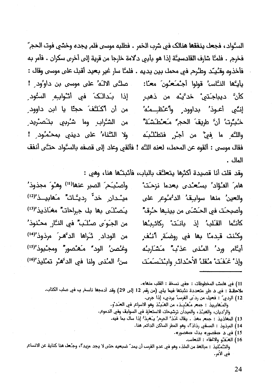 فقال موسى: ألقوه على المحمل، لعنه الله! فألقي به إلى قصفة بالسواد حتى أنفق المال. وقد قلت أنا قصيدة أكثرها يتعلق بالباب، فأثبت هنا، وهي: