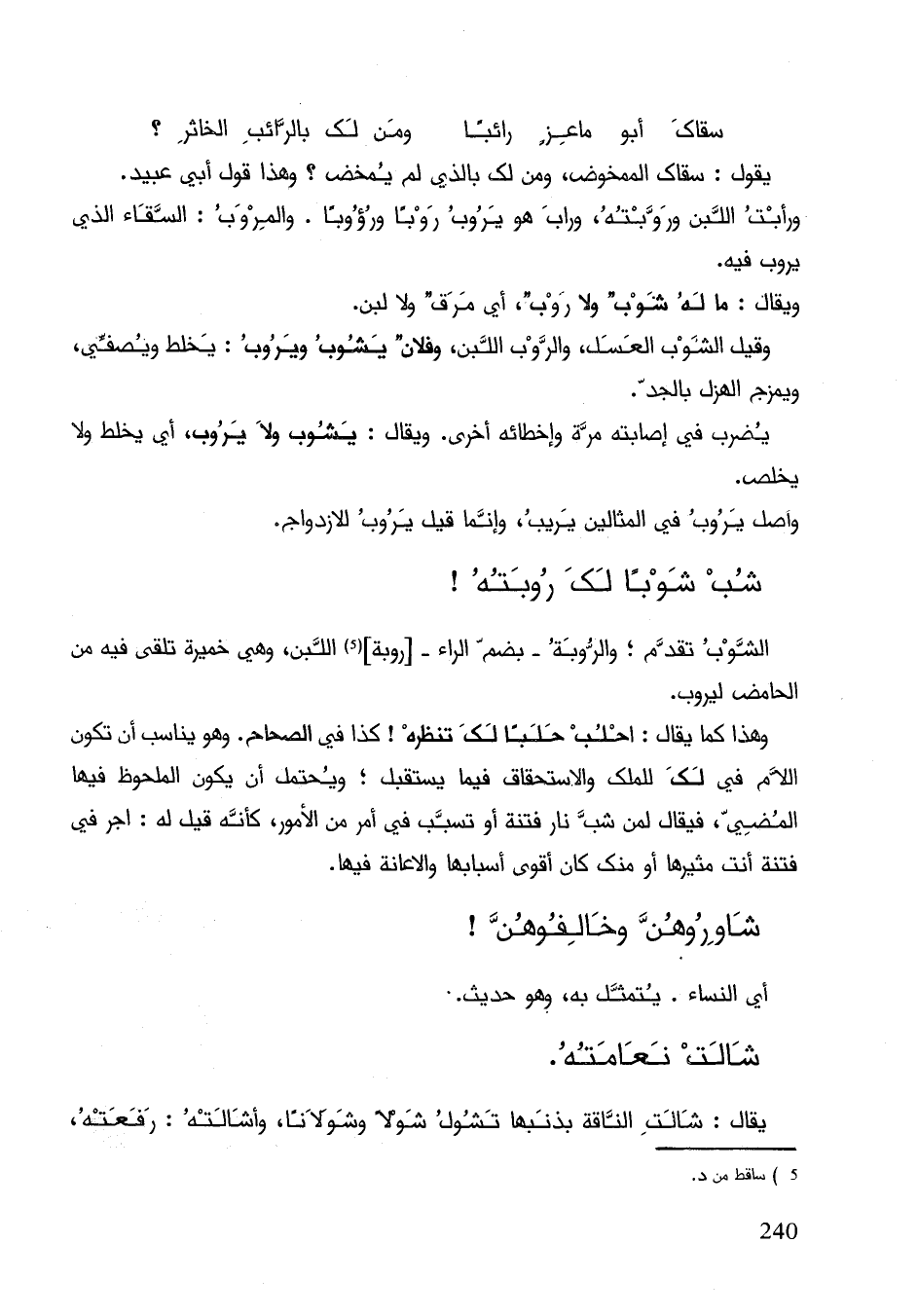 ويقال: ما له شوبٌ ولا روبٌ أي مرق ولا لبن.