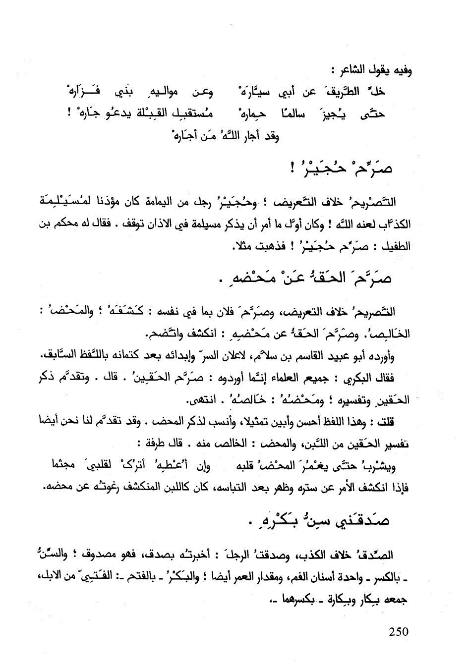 التصريح خلاف التعريض؛ وحجير رجل من اليمامة كان مؤذنا لمسيلمة الكذاب لعنه الله! وكان أوّل ما أمر أنَّ يذكر مسيلمة في الأذان توقف. فقال له محكم بن الطفيل: صرح حجير! فذهبت مثلا.