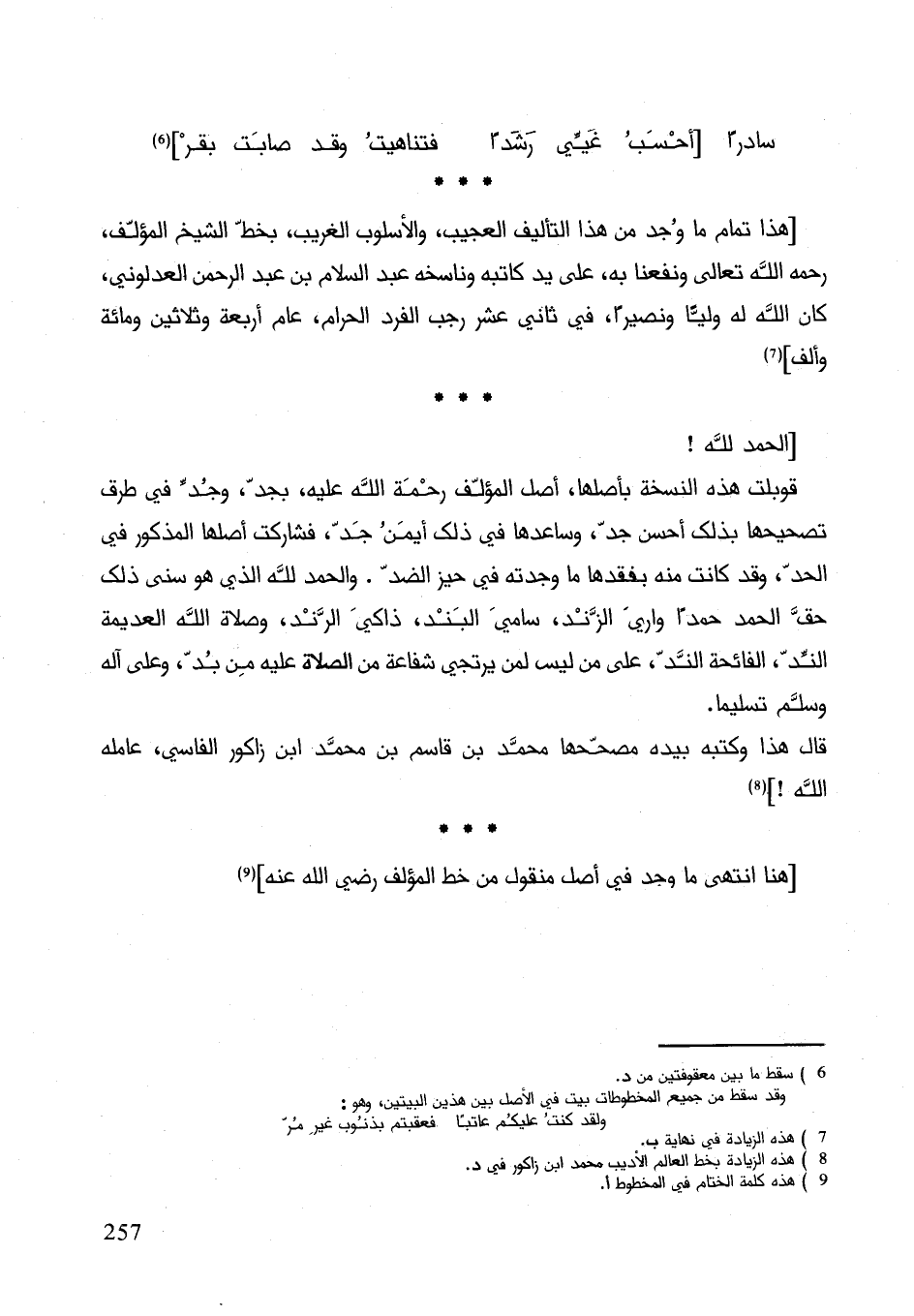 هذا تمام ما وجد من هذا التأليف العجيب، والأسلوب الغريب، بخط الشيخ المؤلف، رحمه الله تعالى ونفعنا به على يد كتابه وناسخه عبد السلام بن عبد الرحمن العدلوني، كان الله له وليا ونصيراً، وفي ثاني عشر من رجب الفرد الحرام، عام أربعة وثلاثين ومائة وألف.