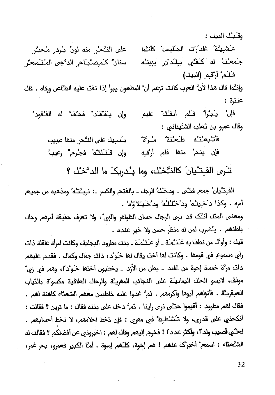 قيل: وأوّل من نطق به غنمة أو عثمة بنت مطرود البجلية وكانت امرأة عاقلة ذات رأي مسموع في قومها. وكانت لها أخت يقال لها خود ذات جمال وكمال. فقدم عليهم ذات مرة خمسة أخوة من غامد بطن من أزد يخطبون أختها خودا وهم في زي مونق لابسو الحلل اليمانية على النجائب المهرية والرحال العلافية مكسوة بالثياب العبقرية. فأنزلهم أبوها وأكرمهم. ثم غدوا عليه خاطبين معهم الشعثاء كاهنة لهم. فقال لهم مطرود: أقيموا حتى نرى رأينا. ثم دخل على بنته فقال: ما ترين؟ فقالت: أنكحني على قدري ولا تشطط في وهري: فإن تخط أحلامهم لا تخط أحسابهم. لعلي أصيب ولدا وأكثر عددا! فخرج إليهم وقال لهم: اخبروني عن أفضلكم؟ فقالت له الشعثاء: اسمع أخبرك عنهم! هم أخوة كلهم أسوة. أما الكبير فعمرو بحر غمر،