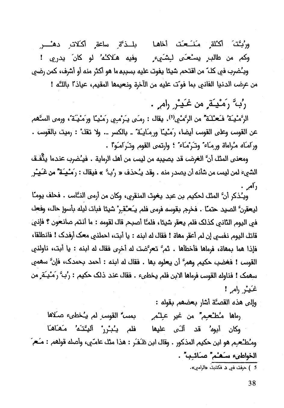 ويذكر أنَّ المثل لحكيم بن عبد يغوث المنقري وكان من أرمى الناس. فحلف يوما ليعقرن الصيد حتما. فخرج بقوسه فرمى فلم يعقر شيئاً فبات ليله بأسوأ حال وفعل في اليوم الثاني كذلك فلم يعقر شيئاً فلما أصبح قال لقومه: ما أنتم صانعون؟ فإني قاتل اليوم نفسي إن لم أعقر مهاة! فقال له ابنه: يا أبت احملني معك أرفدك! فانطلقا فإذا هما بمهاة فرماها فأخطئها. ثم تعرضت له أخرى فقال له ابنه: يا أبت ناولني القوس! فغضب حكيم وهم أن يعلوه بها. فقال له ابنه: أحمد بحمدك فإنَّ سهمي سهمك! فناوله القوس فرماها الابن فلم يخطئ. فقال عند ذلك حكيم: رُبَّ رمية من غير رامٍ! وإلى هذه القصة أشار بعضهم بقوله: