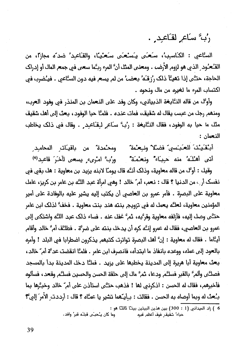 وأوّل من قاله النابغة الذبياني وكان وفد على النعمان بن المنذر في وفود العرب ومنهم رجل من عبس يقال له شقيق فمات عنده. فلما حبا الوفود بعث إلى أهل شقيق مثل ما حبا به الوفود فقال النابغة: رُبَّ ساعٍ لقاعدٍ. وقال في يخاطب النعمان: