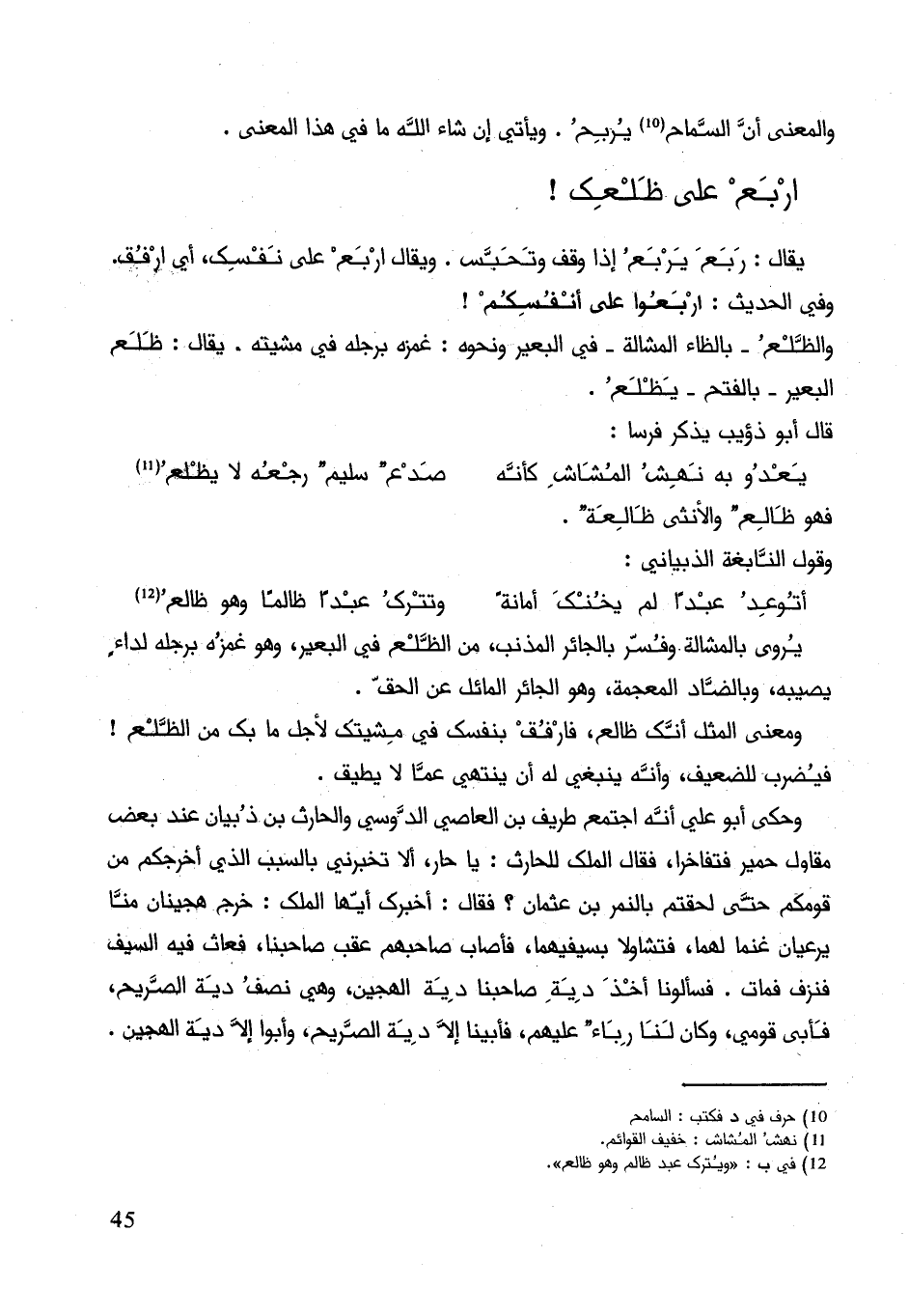 يقال: ربع يربع إذا وقف وتحبس. ويقال أربع على نفسك، أي ارفق. وفي الحديث: أربعوا على أنفسهم! والظلع بالظاء المشالة في البعير ونحوه: غمزة برجله في مشيته. يقال: ظلع البير بالفتح يظلع.