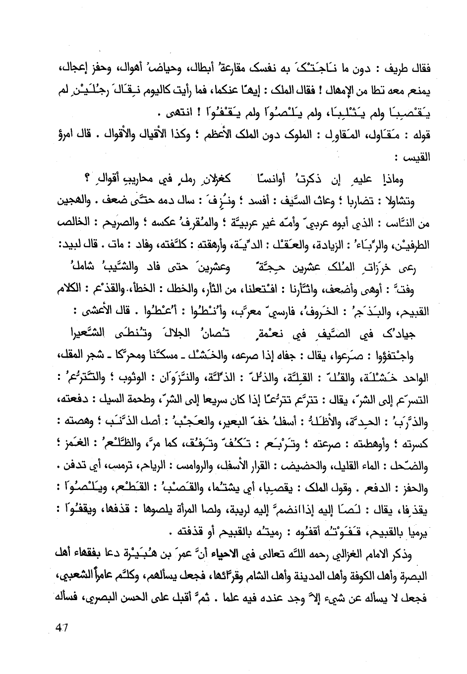 واجتفؤوا: صرعوا، يقال: جفاه إذا صرعه، والخشل مسكنا ومحركا شجر المقل الواحد خشلة، والقل: القلة والذل: الذلة، والنزوالن: الوثوب: والتترع: التسرع إلى الشر، يقال: تترع تترعا إذا كان سريعا إلى الشر، وطمحة السيل: دفعته، والذرب: الحدة، والأظل: اسفل خف البعير، والعجب: أصل الذئب، وهصته: كسرته؛ وأوهطته: صرعته؛ وتربع: تكف وترفق، كما مر، والظلع: الغمز؛ والضحل: الماء القليل، والضيض: القرار الأسفل، والروامس: الرياح، ترمس، أي تدفن. والحفر: الدفع. وقول الملك: يقصبا، أي يشتما، والقصب: القطع ويلصوا: يقذا، يقال: لصا إليه إذا أنضم إليه لريبة، ولصا المرأة يلصوها: قذفها، ويقفوا: يرميا بالقبيح، قفوته أقفوه: رميته بالقبيح أو قذفته.