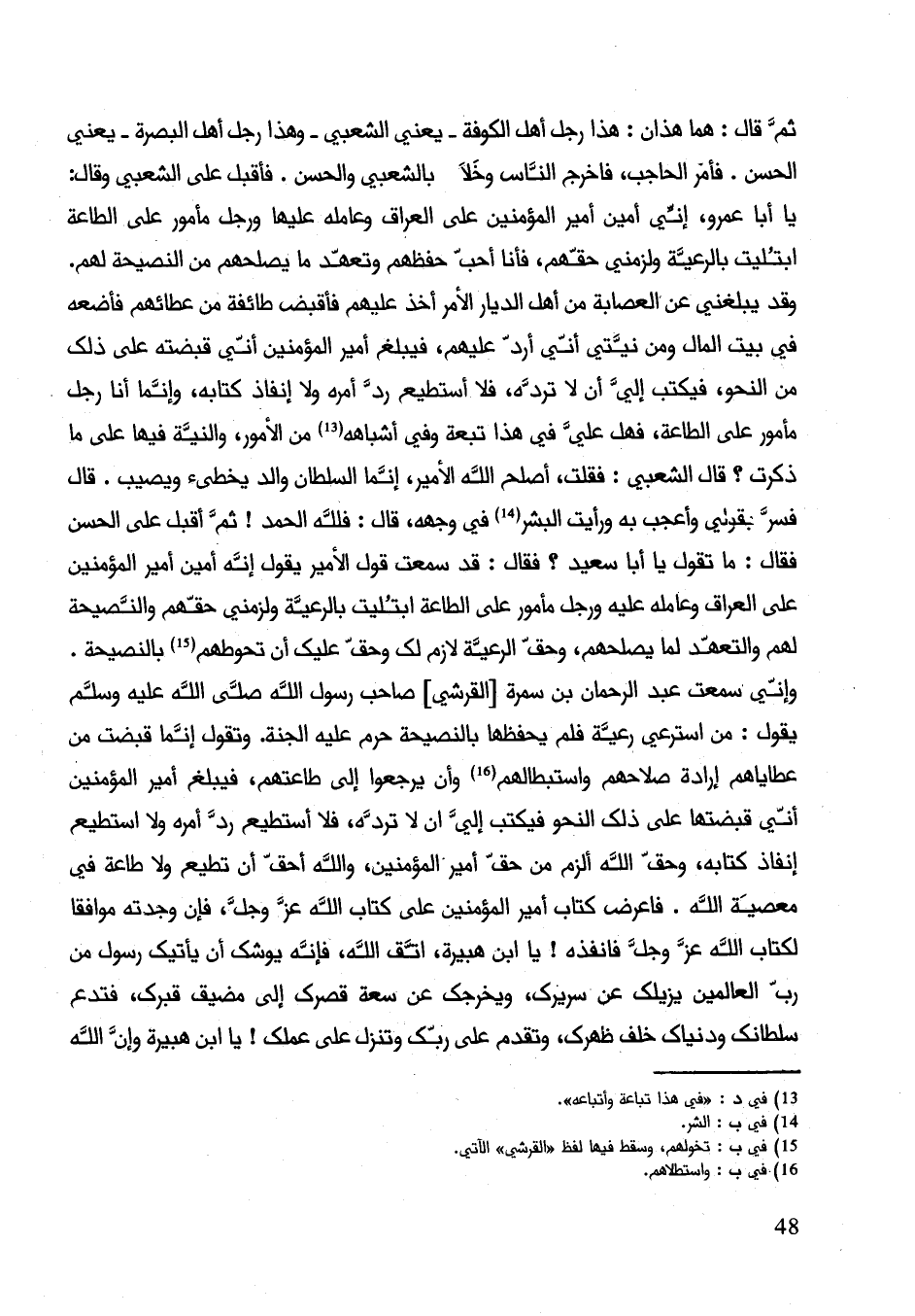 ثم قال: هما هذان: هذا رجل أهل الكوفة يعني الشعبي وهذا رجل أهل البصرة يعني الحسن. فأمر الحاجب، فأخرج الناس وخلا بالشعبي والحسن. فأقبل على الشعبي وقال: يا أبا عمرو، إني أمين أمير المؤمنين على العراق وعامله عليها ورجل مأمور على الطاعة ابتليت بالرعية ولزمني حقهم، فأنا احب حفظهم وتعهد ما يصلحهم من النصيحة لهم. وقد يبلغني عن العصابة من أهل الديار الأمر أخذ عليهم فأقبض طائفة فأضعه في بيت المال ومن نيتي إني رد عليهم، فيبلغ أمير المؤمنين إني قبضته على ذلك من النحو، فيكتب إلي أنَّ لا ترده، فلا أستطيع رد أمره ولا إنفاذ كتابه، وإنّما أنا رجل مأمور على الطاعة، فهل علي في هذا تبعة وفي أشباهه من الأمور، والنية فيها على ما ذكرت؟ قال الشعبي: فقلت، أصلح الله الأمير، إنّما السلطان والدي يخطئ ويصيب. قال: فسر بقولي وأعجب له ورأيت البشر في وجهه، قال: فلله الحمد! ثم أقبل على الحسن فقال: ما تقول يا أبا سعيد؟ قد سمعت قول الأمير يقول إنَّه أمين أمير المؤمنين على العراق وعامله عليه ورجل مأمور على الطاعة أبتليت بالرعية ولزمني حقهم والنصيحة لهم والتعهد لمّا يصلحهم، وحق الرعية لازم لك وحق أنَّ تحوطهم بالنصيحة. وإني سمعت عبد الرحمان ب سمرة القرشي صاحب رسول الله صلى الله عليه وسلم يقول: من استرعي رعية فلم يحفظها بالنصيحة حرم عليه الجنة. وتقول إنّما قبضت من عطاياهم إرادة صلاحهم واستبطالهم وإنَّ يرجعوا إلى طاعتهم، فيبلغ أمير المؤمنين إني قبضتها على ذلك النحوا فيكتب إلي إنَّ لا ترده، فلا أستطيع رد أمره ولا أستطيع إنفاذ كتابه، وحق الله ألزم من حق أمير المؤمنين، والله أحق أنَّ تطيع ولا طاعة في معصية الله. فاعرض كتاب أمير المؤمنين على كتاب الله غز وجل، فإنَّ وجدته موافقا لكتاب الله عز وجل فأنفذه! يا أبن هبيرة، واتق الله، فأنه يوشك إنَّ يأتيك رسول من رب العلمين يزيلك عن سريرك، ويخرجك عن سعة قصرك إلى مضيق فبرك، فتدع سلطانك ودينك خلف ظهرك، وتقدم على ربك وتنزل على عملك! يا أبن هبيرة وإنَّ الله