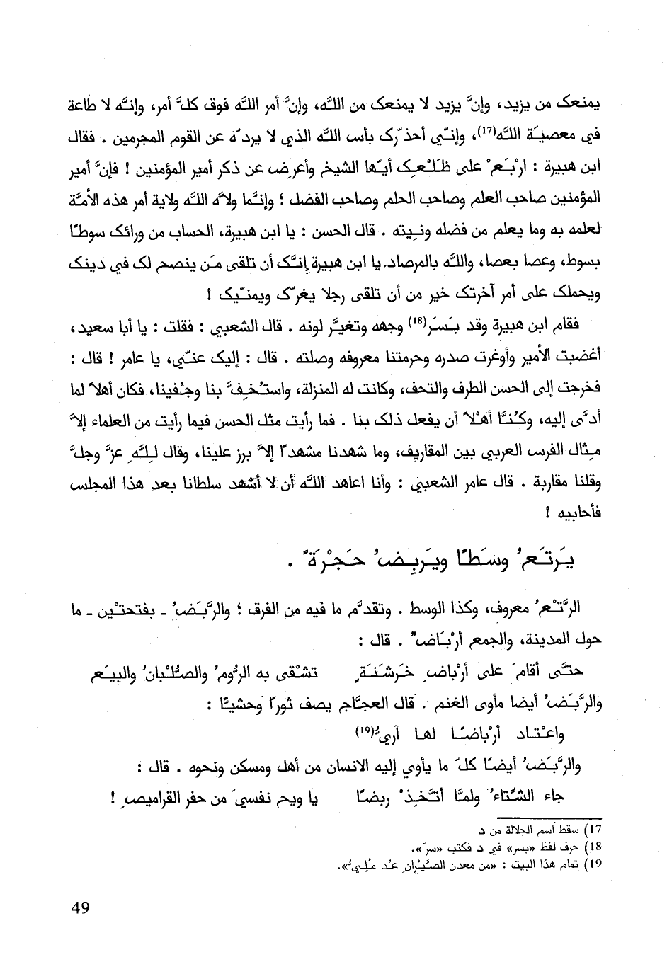 فقام أبن هبيرة وقد بسر وجهه وتغير لونه. قال الشعبي: فقلت: يا أبا سعيد، أغضبت الأمير وأوغرت صدره وحرمتنا معروفه وصلته. قال: إليك عني يا عامر! قال: فخرجت إلى الحسن الطرف والتحف، وكانت له المنزلة، واستخف بنا وجفينا، فكان أهلا لمّا أدى إليه، وكنا أهلا أنَّ يفعل ذلك بنا. فما رأيت مثل الحسن فما رأيت من العلماء إلاّ مثال الفرس العربي بين المقاريف، وما شهدنا مشهدا إلاّ برز علينا، وقال لله عز وجل وقلنا مقاربة. قال عامر الشعبي: وأنا أعاهد الله أنَّ أشهد سلطانا بعد هذا المجلس فأجابه!