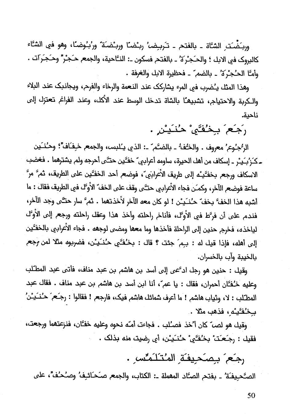الرجوع معروف. والخف بالضم: الذي يلبس، والجمع خفاف؛ والحنين كزبير إسكاف من أهل الحيرة، ساومه أعرابي خفين حتى أحرجه ولم يشترهما. فغضب الأسكاف ورجع بخفيه إلى طريق الأعرابي، فوضع أحد الخفين على الطريق، ثم مر ساعة فوضع الآخر، وكمن فجاء الأعرابي وقف على الخف الأول في الطريق فقال: ما أشبه هذا الخف بخفي حنين! لو كان معه الآخر لأخذتهما. ثم سار حتى وجد الآخر، فندم على أنَّ فرط في الأول، فأناخ راحلته وأخذ هذا وعقل راحلته ورجع إلى الأول ليأخذه، فخرج حنين إلى الراحلة فأخذها وما معها ومضى لوجهه. فجاء الأعرابي بالخفين إلى أهله، فإذا قيل له: بم جئت؟ قال: بخفي حنين، فضربوه مثلا لمن رجع بالخيبة وآب بالخسران.