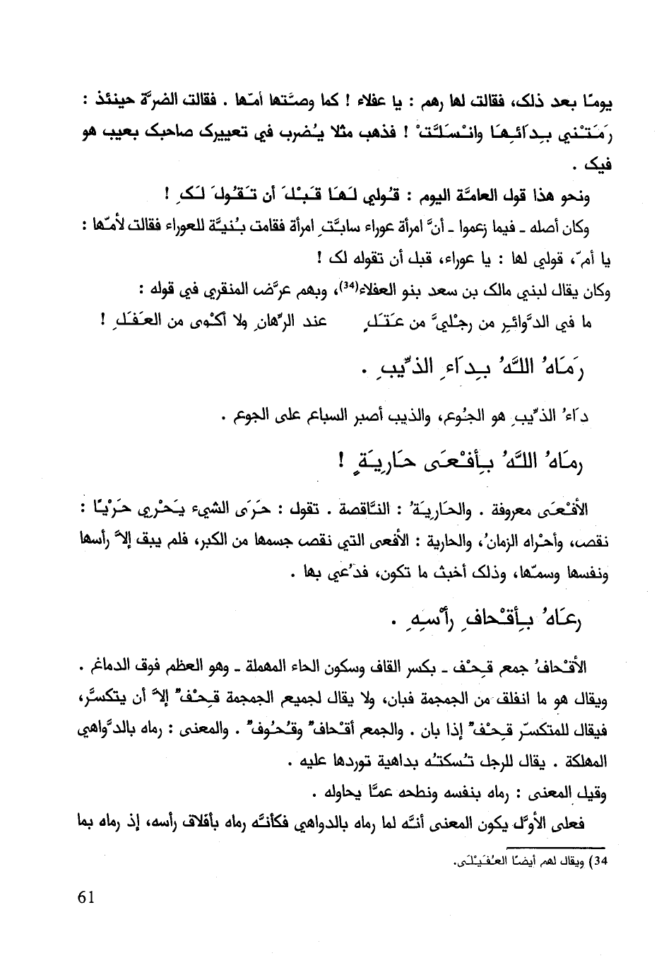 ونحو هذا قول العامة اليوم: قولي لها قبل أن تقول لك! وكان أصله فيما زعموا أنَّ امرأة عوراء سابت امرأة فقامت بنية للعوراء فقالت لأمها: يا أم قولي لها: يا عوراء قبل أن تقوله لك! وكان يقال لبني مالك بن سعد بنو العفلاء وبهم عرض النقري في قوله: