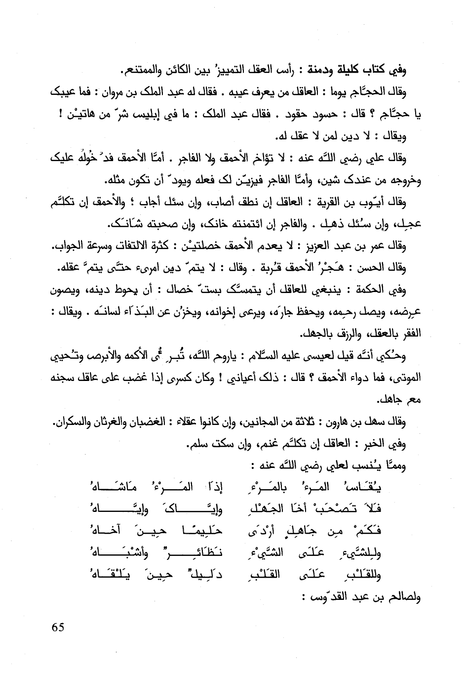 وقال عمر بن عبد العزيز: لا يعدم الأحمق خصلتين: كثرة الالتفات وسرعة الجواب. وقال الحسن: هجر الأحمق قربة. وقال: لا يتم دين امرئ حتى يتم عقله. وفي الحكمة: ينبغي للعاقل أنَّ يتمسك بست خصال: أن يحوط دينه، ويصون عرضه، ويصل رحمه، ويحفظ جاره، ويرعى إخوانه، ويخزن عن البذاء لسانه. ويقال: الفقر بالعقل، والرزق بالجهل.