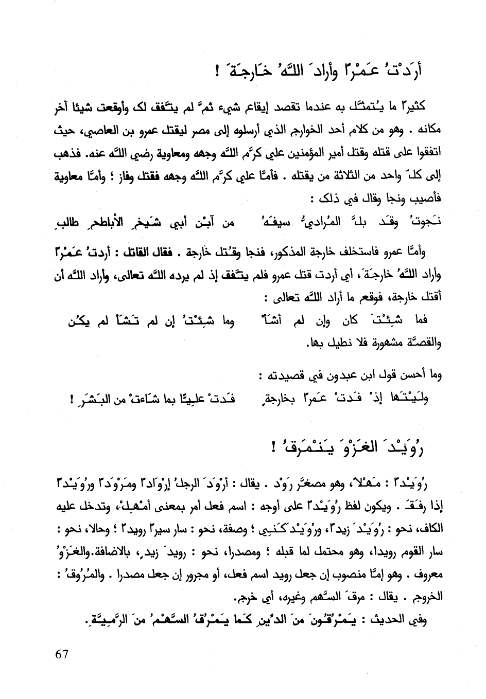 رويدا: مهلاً، وهو مصغر رود. يقال: أورد الرجل إرواد ومورداً ورويداً إذا رفق. ويكون لفظ رويداً على أوجه: اسم فعل أمر بمعنى أمهل، وتدخل عليه الكاف، نحو: رويدا زيداً، ورويد كني؛ وصفة، نحو سار سيراُ رويدا؛ وحالا، نحو: سار القوم رويدا، وهو محتمل لمّا قبله؛ ومصدرا، نحو: رويد زيد، بالإضافة. والغزو معروف. وهو أما منصوب إنَّ جعل رويد اسم فعل مجرور إنَّ جعل مصدرا. والمروق: الخروج. يقال: مرق السهم وغيره، أي خرج. وفي الحديث: يمرقون من الدين كما يمرق السهم من الرمية.