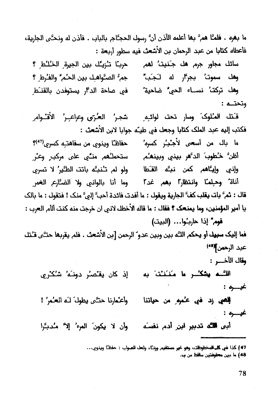 قال: ثم بات يقلب كف الجارية ويقول: ما أفدت فائدة أحب إلي منك! فتقول: ما بالك يا أمير المؤمنين وما يمنعك؟ فقال: ما قاله الأخطل لأني إن خرجت منه كنت ألأم العرب: قومٌ إذا حاربوا. . " البيت " فما إليك سبيل أو يحكم الله بيني وبين عدو الرحمن بن الأشعث. فلم يقربها حتى قُتل عبد الرحمن.