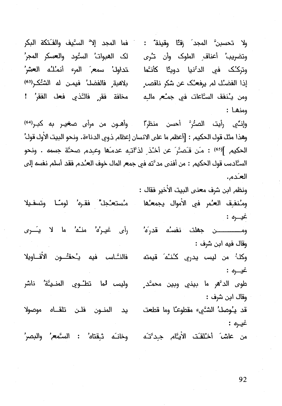 وإني مثل قول الحكيم: أعظم ما على الإنسان إعظام ذوي الدناءة. ونحو البيت الأول قول الحكيم: من قصر عن أخذ لذاته عدمها وعدم صحة جسمه. ونحو السادس قول الحكيم: من أفنى مدته في جمع المال خوف العدم فقد اسلم نفسه إلى العدم.