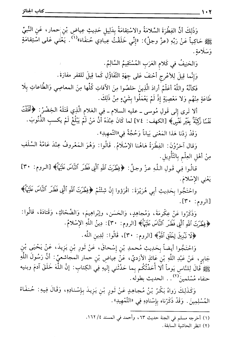 وَذَلِكَ أَنَّ الْفِطْرَةَ السَّلَامَةُ وَالِاسْتِقَامَةُ بِدَلِيلِ حَدِيثِ عِيَاضِ بْنِ حِمَارٍ عَنِ النَّبِيِّ صَلَّى اللَّهُ عَلَيْهِ وَسَلَّمَ حَاكِيًا عَنْ رَبِّهِ (عَزَّ وَجَلَّ) إِنِّي خَلَقْتُ عِبَادِي حُنَفَاءَ يَعْنِي عَلَى اسْتِقَامَةٍ وَسَلَامَةٍ