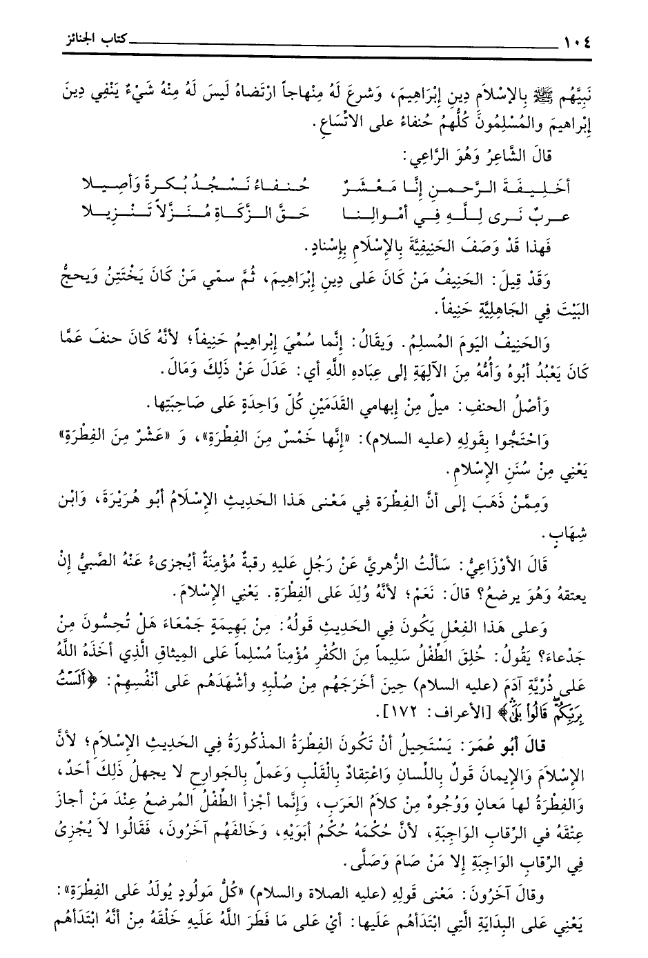 قَالَ أَبُو عُمَرَ يَسْتَحِيلُ أَنْ تَكُونَ الْفِطْرَةُ الْمَذْكُورَةُ فِي الْحَدِيثِ الْإِسْلَامَ لِأَنَّ الْإِسْلَامَ وَالْإِيمَانَ قَوْلٌ بِاللِّسَانِ وَاعْتِقَادٌ بِالْقَلْبِ وَعَمَلٌ بِالْجَوَارِحِ لَا يَجْهَلُ ذَلِكَ أَحَدٌ وَالْفِطْرَةُ لَهَا مَعَانٍ وَوُجُوهٌ مِنْ كَلَامِ الْعَرَبِ وَإِنَّمَا أَجَزَأَ الطِّفْلُ الْمُرْضِعُ عِنْدَ مَنْ أَجَازَ عِتْقَهُ فِي الرِّقَابِ الْوَاجِبَةِ لِأَنَّ حُكْمَهُ حُكْمُ أَبَوَيْهِ وَخَالَفَهُمْ آخَرُونَ فَقَالُوا لَا يُجْزِئُ فِي الرِّقَابِ الْوَاجِبَةِ إِلَّا مَنْ صَامَ وَصَلَّى