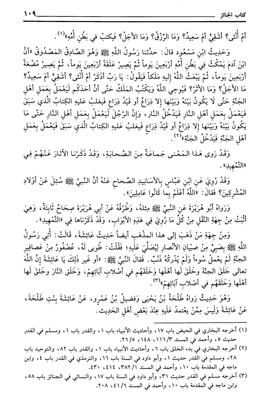 وَمِنْ جِهَةِ مَنْ ذَهَبَ إِلَى هَذَا الْمَذْهَبِ أَيْضًا حَدِيثُ عَائِشَةَ قَالَتْ أُتِيَ رَسُولُ اللَّهِ صَلَّى اللَّهُ عَلَيْهِ وَسَلَّمَ بِصَبِيٍّ مِنْ صِبْيَانِ الْأَنْصَارِ لِيُصَلِّيَ عَلَيْهِ فَقُلْتُ طُوبَى لَهُ عُصْفُورٌ مِنْ عَصَافِيرِ الْجَنَّةِ لَمْ يَعْمَلْ سُوءًا وَلَمْ يُدْرِكْهُ ذَنْبٌ فَقَالَ النَّبِيُّ صَلَّى اللَّهُ عَلَيْهِ وَسَلَّمَ أَوْ غَيْرُ ذَلِكَ يَا عَائِشَةُ إِنَّ اللَّهَ تَعَالَى خَلَقَ الْجَنَّةَ وَخَلَقَ لَهَا أَهْلَهَا وَخَلَقَهُمْ فِي أَصْلَابِ آبَائِهِمْ وَخَلَقَ النَّارَ وَخَلَقَ لَهَا أَهْلَهَا وَخَلَقَهُمْ فِي أَصْلَابِ آبَائِهِمْ