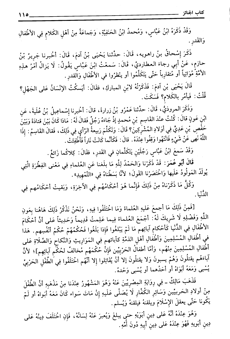 فَمِنْ ذَلِكَ مَا أَجْمَعَ عَلَيْهِ الْعُلَمَاءُ وَمَا اخْتَلَفُوا فِيهِ وَنَحْنُ نذكر ذلك ها هنا بِعَوْنِ اللَّهِ وَفَضْلِهِ لَا شَرِيكَ لَهُ أَجْمَعَ الْعُلَمَاءُ فِيمَا عَلِمْتُ قَدِيمًا وَحَدِيثًا عَلَى أَنَّ أَحْكَامَ الْأَطْفَالِ فِي الدُّنْيَا كَأَحْكَامِ آبَائِهِمْ مَا لَمْ يَبْلُغُوا فَإِذَا بَلَغُوا فَحُكْمُهُمْ حُكْمُ أَنْفُسِهِمْ هَذَا فِي أَطْفَالِ الْمُسْلِمِينَ وَأَطْفَالِ أَهْلِ الذِّمَّةِ كَآبَائِهِمْ فِي الْمَوَارِيثِ وَالنِّكَاحِ وَالصَّلَاةِ عَلَى أَطْفَالِ الْمُسْلِمِينَ مِنْهُمْ وَأَمَّا أَطْفَالِ الْحَرْبِيِّينَ فَإِنَّ حُكْمَهُمْ مُخَالِفٌ لِحُكْمِ آبَائِهِمْ لِأَنَّ آبَاءَهُمْ يَقْتُلُونَ وَهُمْ يُسْبَوْنَ وَلَا يُقْتَلُونَ إِلَّا أَنْ يُقَاتِلُوا إِلَّا أَنَّهُمُ اخْتَلَفُوا فِي الطِّفْلِ الْحَرْبِيِّ يُسْبَى وَمَعَهُ أَبَوَاهُ أَوْ أَحَدُهُمَا أَوْ يُسْبَى وَحْدَهُ