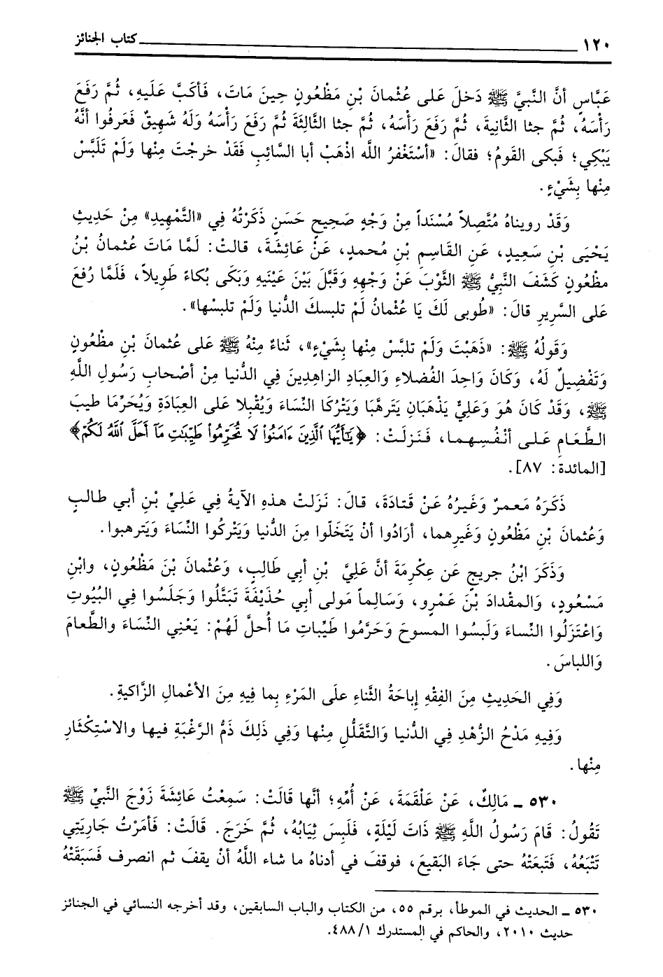 وَقَدْ رَوَيْنَاهُ مُتَّصِلًا مُسْنَدًا مِنْ وَجْهٍ صَحِيحٍ حَسَنٍ ذَكَرْتُهُ فِي التَّمْهِيدِ مِنْ حَدِيثِ يَحْيَى بْنِ سَعِيدٍ عَنِ الْقَاسِمِ بْنِ مُحَمَّدٍ عَنْ عَائِشَةَ قَالَتْ لَمَّا مَاتَ عُثْمَانُ بْنُ مَظْعُونٍ كَشَفَ النَّبِيُّ صَلَّى اللَّهُ عَلَيْهِ وَسَلَّمَ الثَّوْبَ عَنْ وَجْهِهِ وَقَبَّلَ بَيْنَ عَيْنَيْهِ وَبَكَى بُكَاءً طَوِيلًا فَلَمَّا رُفِعَ عَلَى السَّرِيرِ قَالَ طُوبَى لَكَ يَا عُثْمَانُ لَمْ تَلْبَسْكَ الدُّنْيَا وَلَمْ تَلْبَسْهَا
