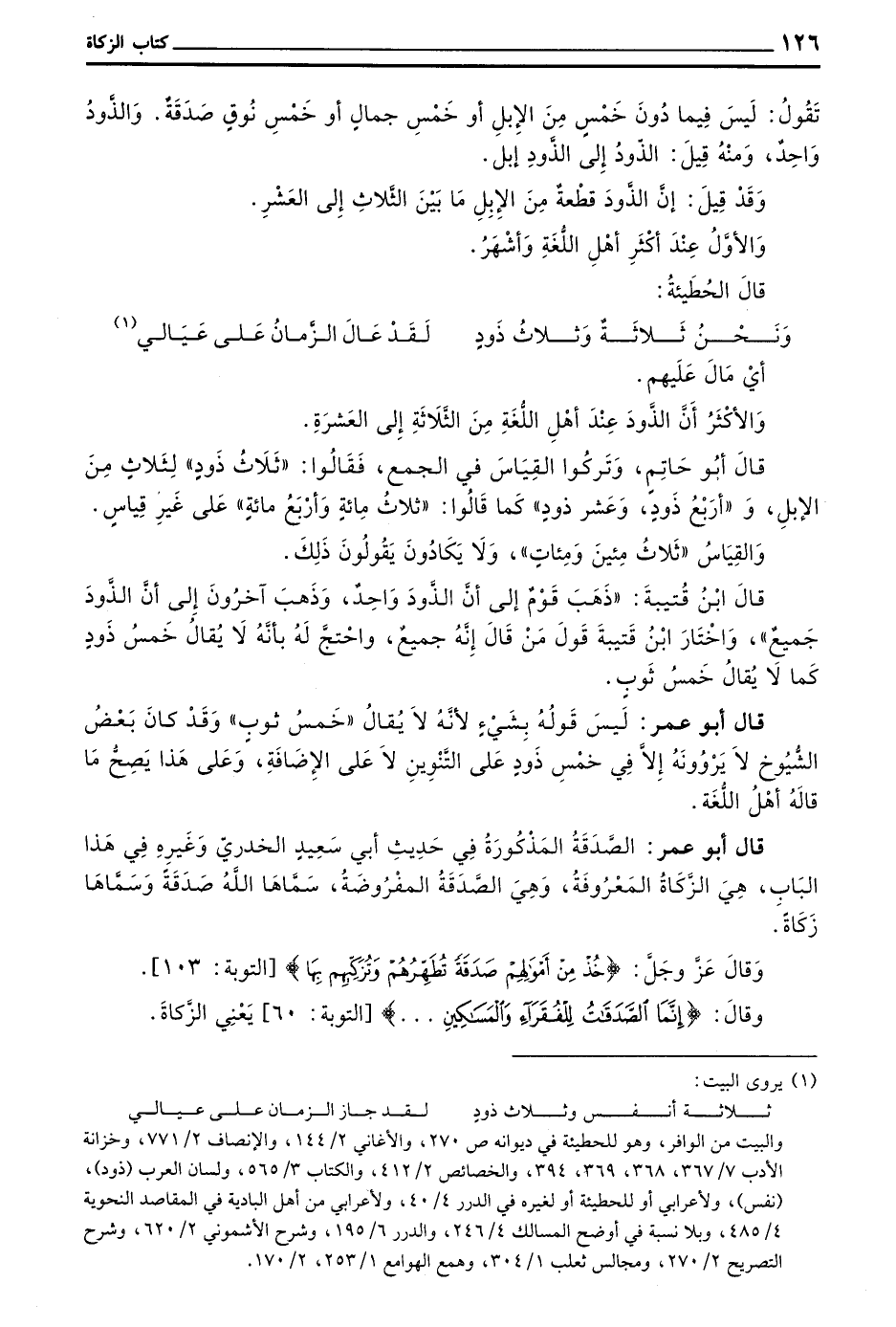 قال بن قُتَيْبَةَ ذَهَبَ قَوْمٌ إِلَى أَنَّ الذَّوْدَ وَاحِدٌ وَذَهَبَ آخَرُونَ إِلَى أَنَّ الذَّوْدَ جَمِيعٌ وَاخْتَارَ بن قُتَيْبَةَ قَوْلَ مَنْ قَالَ إِنَّهُ جَمِيعٌ وَاحْتَجَّ لَهُ بِأَنَّهُ لَا يُقَالُ خَمْسُ ذَوْدٍ كَمَا لَا يُقَالُ خَمْسُ ثَوْبٍ