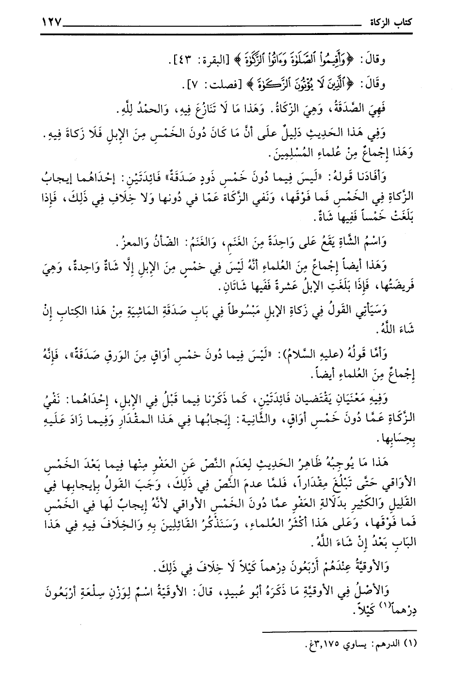 وَأَمَّا قَوْلُهُ (عَلَيْهِ السَّلَامُ) لَيْسَ فِيمَا دُونَ خَمْسِ أَوَاقٍ مِنَ الْوَرِقِ صَدَقَةٌ فَإِنَّهُ إِجْمَاعٌ مِنَ الْعُلَمَاءِ أَيْضًا