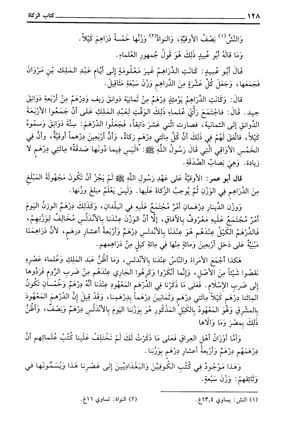 هَكَذَا أَجْمَعَ الْأُمَرَاءُ وَالنَّاسُ عِنْدَنَا بِالْأَنْدَلُسِ وَمَا أَظُنُّ عَبْدَ الْمَلِكِ وَعُلَمَاءَ عَصْرِهِ نَقَصُوا شَيْئًا مِنَ الْأَصْلِ وَإِنَّمَا أَنْكَرُوا وَكَرِهُوا الْجَارِي عِنْدَهُمْ مِنْ ضَرْبِ الرُّومِ فَرَدُّوهَا إِلَى ضَرْبِ الْإِسْلَامَ فَعَلَى مَا ذَكَرْنَا فِي الدِّرْهَمِ الْمَعْهُودِ عِنْدَنَا أَنَّهُ دِرْهَمٌ وَخُمُسَانِ تَكُونُ الْمِائَتَا دِرْهَمٍ كَيْلًا مِائَتَيْ دِرْهَمٍ وَثَمَانِينَ دِرْهَمًا بِدِرْهَمِنَا وَقَدْ قِيلَ إِنَّ الدِّرْهَمَ الْمَعْهُودَ بِالْمَشْرِقِ وَهُوَ الْمَعْهُوُدُ بِالْكَيْلِ الْمَذْكُورِ هُوَ بِوَزْنِنَا الْيَوْمَ بِالْأَنْدَلُسِ دِرْهَمٌ وَنَصِفٌ وَأَظُنُّ ذَلِكَ بِمِصْرَ وَمَا وَالَاهَا