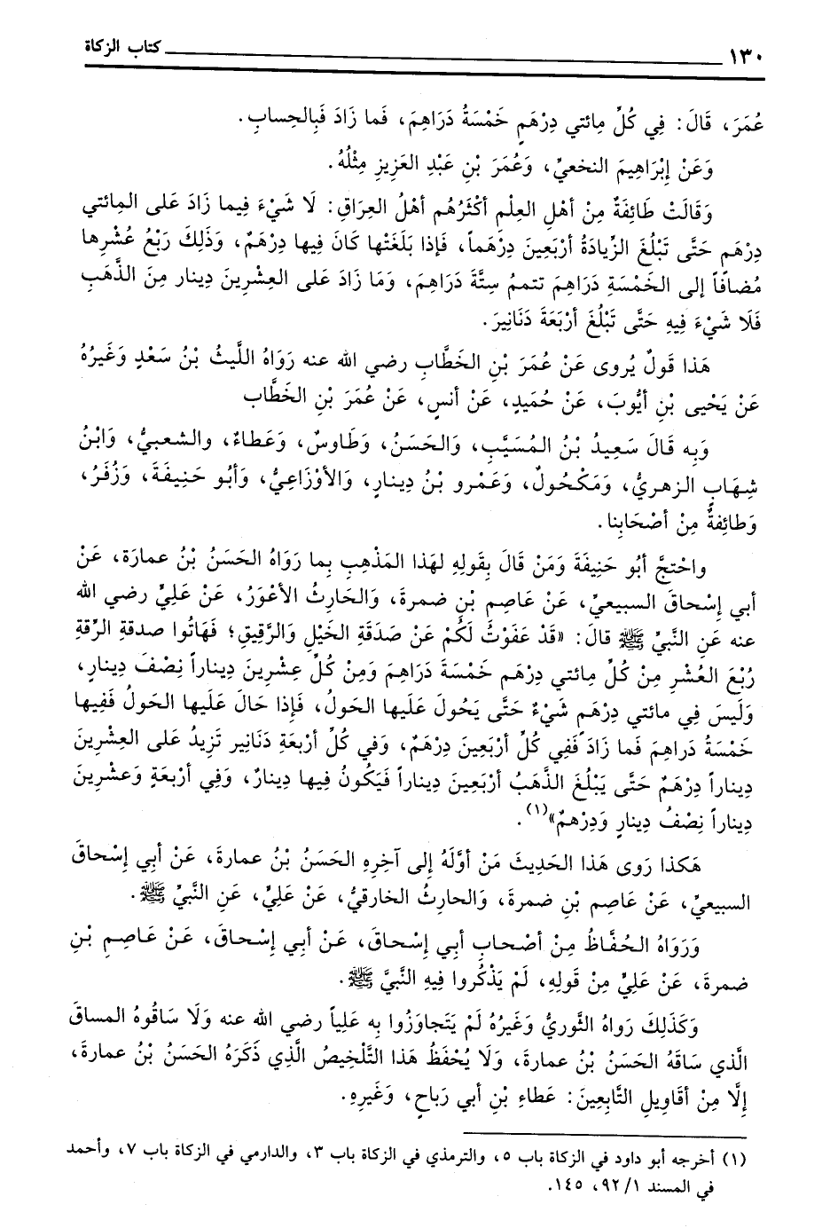 وَاحْتَجَّ أَبُو حَنِيفَةَ وَمَنْ قَالَ بِقَوْلِهِ لِهَذَا الْمَذْهَبِ بِمَا رَوَاهُ الْحَسَنُ بْنُ عُمَارَةَ عَنْ أَبِي إسحاق السبيعي عن عاصم بن ضمرة والحارث الْأَعْوَرُ عَنْ عَلِيٍّ رَضِيَ اللَّهُ عَنْهُ عَنِ النَّبِيِّ صَلَّى اللَّهُ عَلَيْهِ وَسَلَّمَ قَالَ قَدْ عَفَوْتُ لَكُمْ عَنْ صَدَقَةِ الْخَيْلِ وَالرَّقِيقِ فَهَاتُوا صَدَقَةَ الرِّقَةِ رُبُعَ الْعُشْرِ مِنْ كُلِّ مِائَتَيْ دِرْهَمٍ خَمْسَةَ دَرَاهِمَ وَمِنْ كُلِّ عِشْرِينَ دِينَارًا نِصْفَ دِينَارٍ وَلَيْسَ فِي مِائَتَيْ دِرْهَمٍ شَيْءٌ حَتَّى يَحُولَ عَلَيْهَا الْحَوْلُ فَإِذَا حَالَ عَلَيْهَا الْحَوْلُ فَفِيهَا خَمْسَةُ دَرَاهِمَ فَمَا زَادَ فَفِي كل أربعين دِرْهَمٌ وَفِي كُلِّ أَرْبَعَةِ دَنَانِيرَ تَزِيدُ عَلَى الْعِشْرِينَ دِينَارًا دِرْهَمٌ حَتَّى يَبْلُغَ الذَّهَبُ أَرْبَعِينَ دِينَارًا فَيَكُونُ فِيهَا دِينَارٌ وَفِي أَرْبَعَةٍ وَعِشْرِينَ دِينَارًا نِصْفُ دِينَارٍ وَدِرْهَمٌ