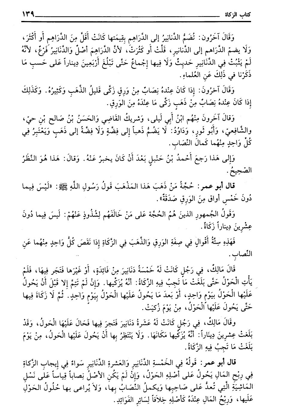 قَالَ أَبُو عُمَرَ قَوْلُهُ فِي الْخَمْسَةِ الدَّنَانِيرِ وَالْعَشَرَةِ الدَّنَانِيرِ سَوَاءٌ فِي إِيجَابِ الزَّكَاةِ فِي رِبْحِ الْمَالِ يَحُولُ عَلَى أَصْلِهِ الْحَوْلُ وَإِنْ لَمْ يَكُنِ الْأَصْلُ نِصَابًا قِيَاسًا عَلَى نَسْلِ الْمَاشِيَةِ الَّتِي تُعَدُّ عَلَى صَاحِبِهَا وَيَكْمُلُ النِّصَابُ بِهَا وَلَا يُرَاعَى بِهَا حُلُولُ الْحَوْلِ عَلَيْهَا وَرِبْحُ الْمَالِ عِنْدَهُ كَأَصْلِهِ خِلَافًا لِسَائِرِ الْفَوَائِدِ