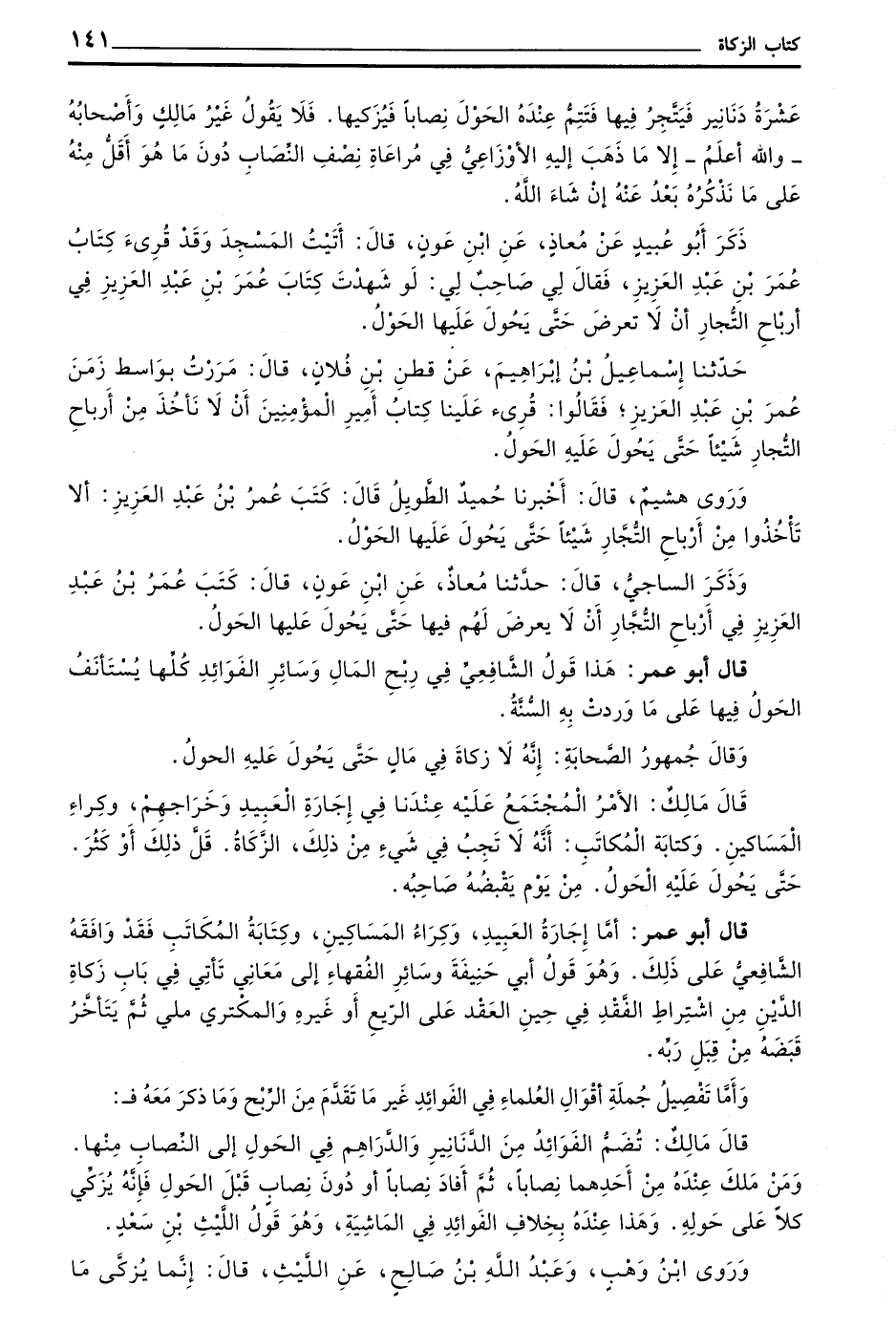 ذَكَرَ أَبُو عُبَيْدٍ عَنْ معاذ عن بن عَوْنٍ قَالَ أَتَيْتُ الْمَسْجِدَ وَقَدْ قُرِئَ كِتَابُ عُمَرَ بْنِ عَبْدِ الْعَزِيزِ فَقَالَ لِي صَاحِبٌ لِي لَوْ شَهِدْتَ كِتَابَ عُمَرَ بْنِ عَبْدِ الْعَزِيزِ فِي أَرْبَاحِ التُّجَّارِ أَنْ لَا تُعْرَضَ حَتَّى يَحُولَ عَلَيْهَا الْحَوْلُ
