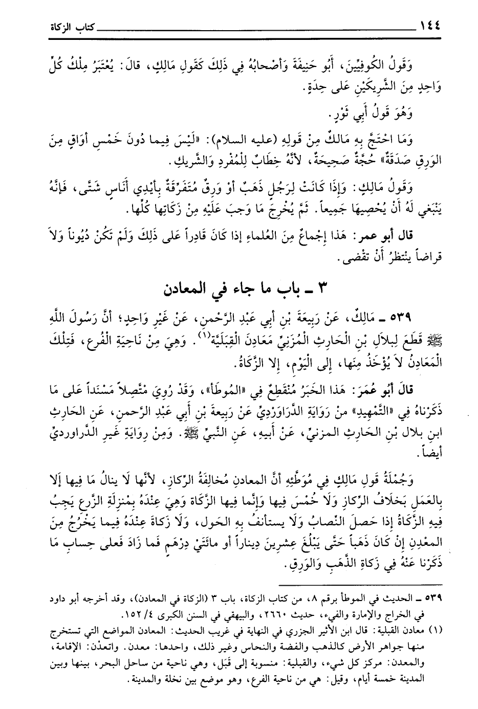 539 - مَالِكٌ عَنْ رَبِيعَةَ بْنِ أَبِي عَبْدِ الرَّحْمَنِ عَنْ غَيْرِ وَاحِدٍ أَنَّ رَسُولَ اللَّهِ صَلَّى اللَّهُ عَلَيْهِ وسلم قَطْعَ لِبِلَالِ بْنِ الْحَارِثِ الْمُزَنِيِّ مَعَادِنَ الْقَبَلِيَّةِ وَهِيَ مِنْ نَاحِيَةِ الْفُرْعُ فَتِلْكَ الْمَعَادِنُ لَا يُؤْخَذُ مِنَهَا إِلَى الْيَوْمَ إِلَّا الزَّكَاةُ
