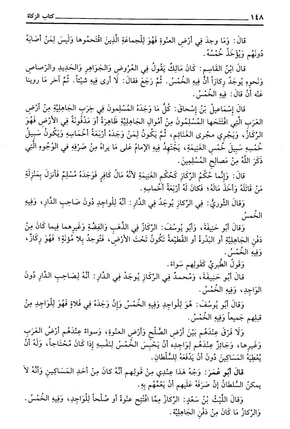 قَالَ إِسْمَاعِيلُ بْنُ إِسْحَاقَ كُلُّ مَا وَجَدَهُ الْمُسْلِمُونَ فِي خِرَبِ الْجَاهِلِيَّةِ مِنْ أَرْضِ الْعَرَبِ الَّتِي افْتَتَحَهَا الْمُسْلِمُونَ مِنْ أَمْوَالِ الْجَاهِلِيَّةِ ظَاهِرَةً أَوْ مَدْفُونَةً فِي الْأَرْضِ فَهُوَ الرِّكَازُ وَيَجْرِي مَجْرَى الْغَنَائِمِ ثُمَّ يَكُونُ لِمَنْ وَجَدَهُ أَرْبَعَةُ أَخْمَاسِهِ وَيَكُونُ سَبِيلُ خُمُسِهِ سَبِيلَ خُمُسِ الْغَنِيمَةِ يَجْتَهِدُ فِيهِ الْإِمَامُ عَلَى مَا يَرَاهُ مِنْ صَرْفِهِ فِي الْوُجُوهِ الَّتِي ذَكَرَ اللَّهُ مِنْ مَصَالِحِ الْمُسْلِمِينَ